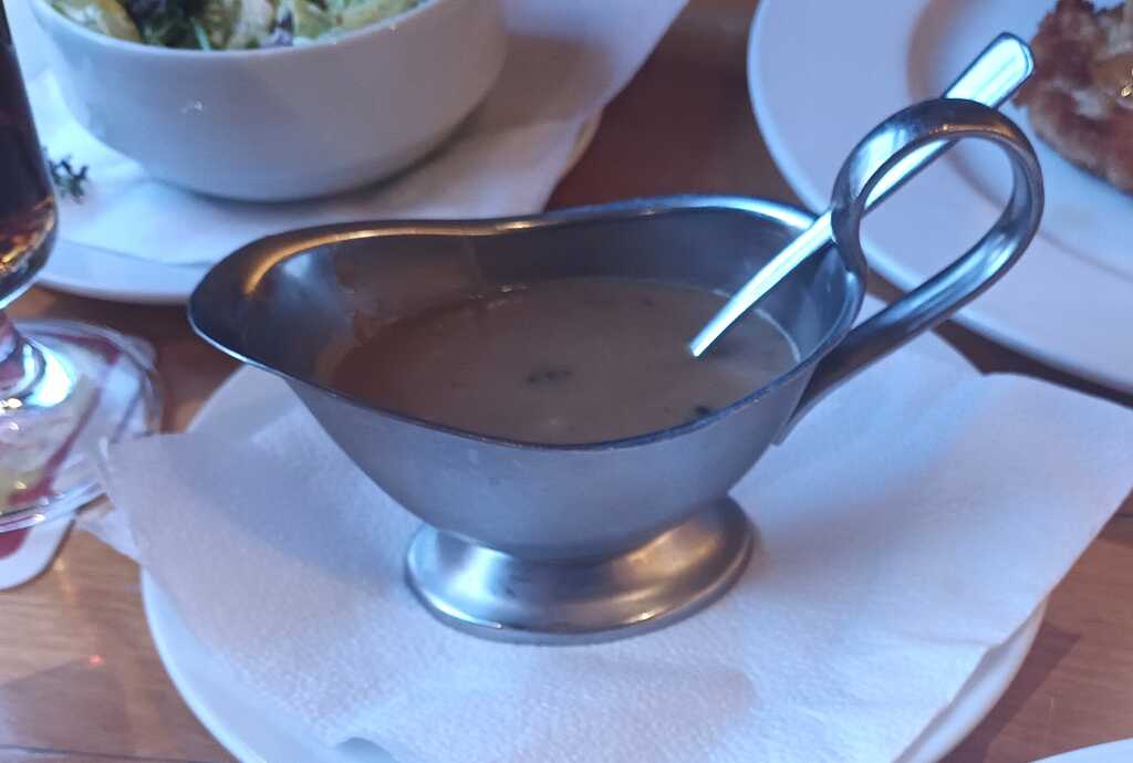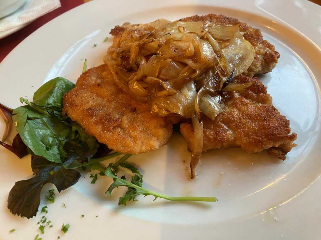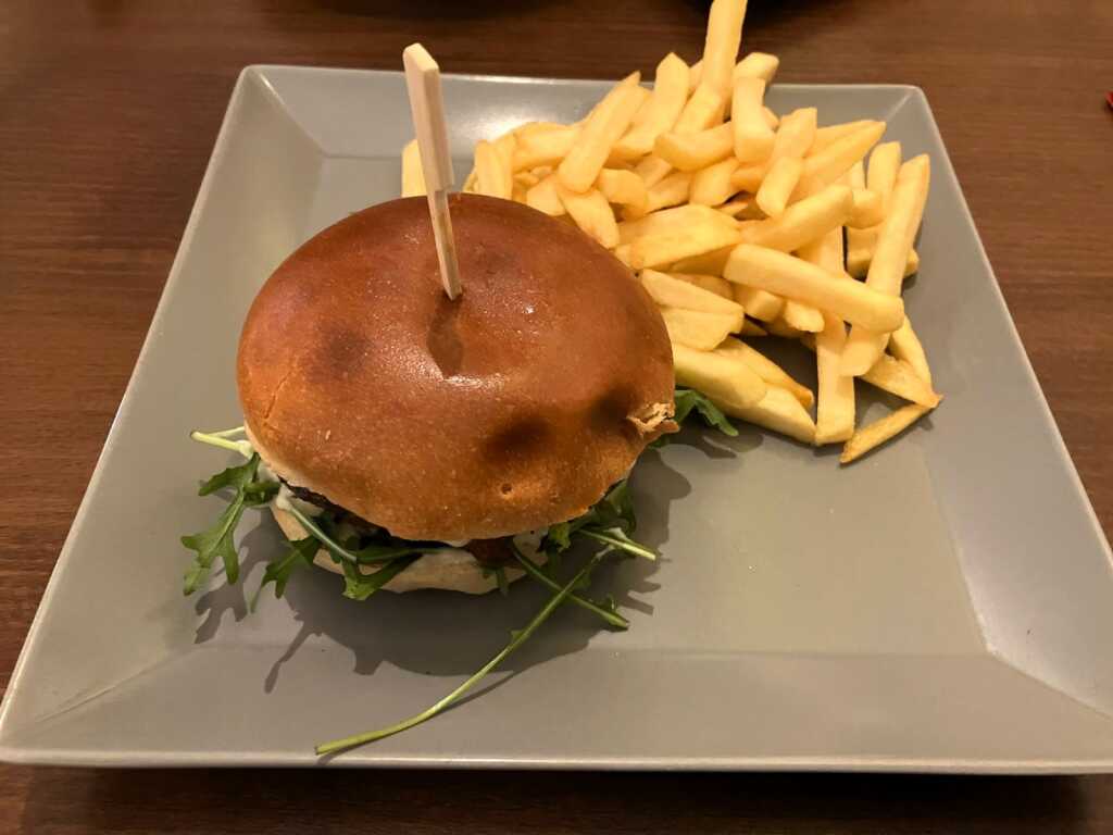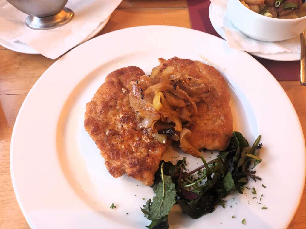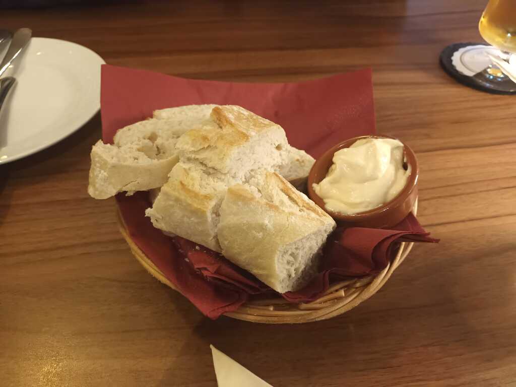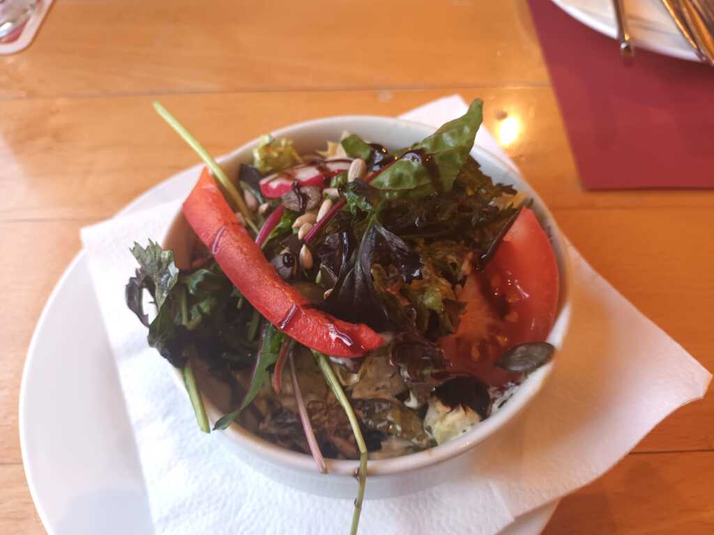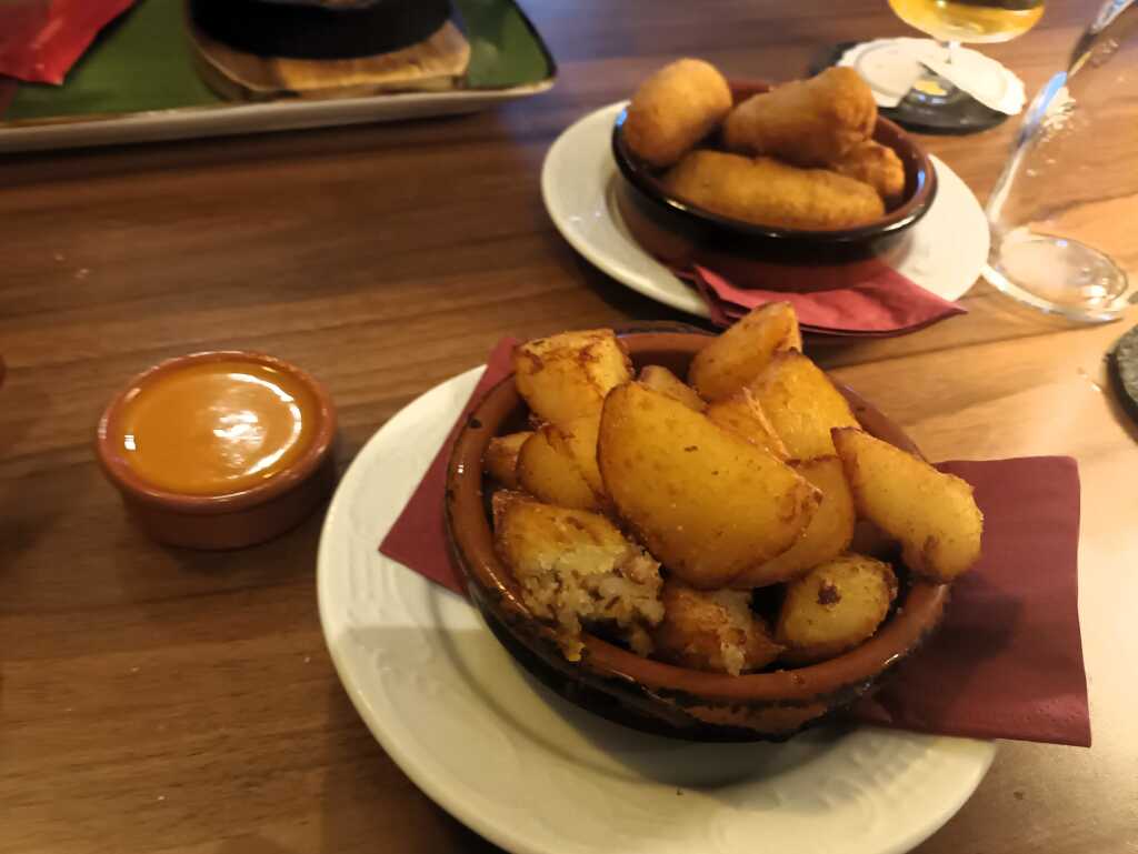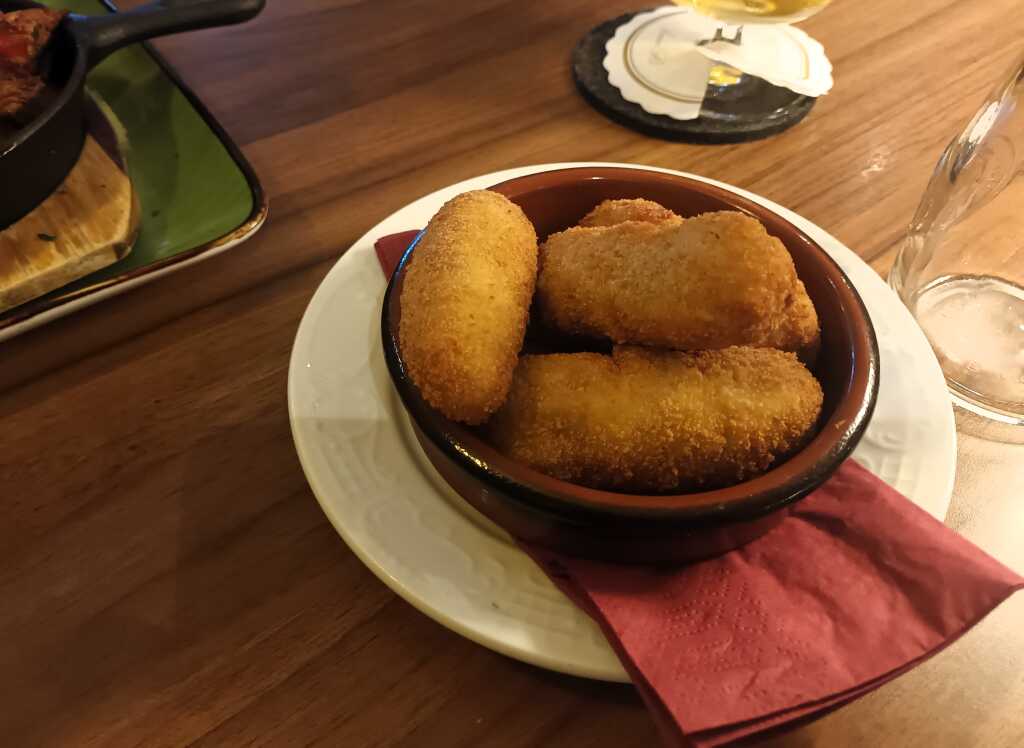Arancini (frittiertes Reisbällchen) gefüllt mit Aubergine, Tomate, Knoblauch und Mozzarella - schön heiß und geschmacklich sehr gut, angenehme Knoblauchnote - ordentliche Bratkartoffeln, schön dünn geschnitten und gut gebraten