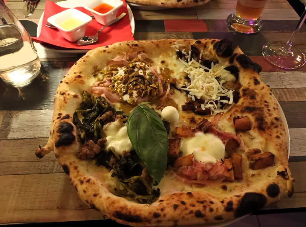 Pizza des Monats - Salsiccia und Friarielli - Rosmarinkartoffeln und Kochschinken - Mortadella mit Stracciata, Pistazien und Pistaziencreme - Frittierte Aubergine mit Kirschtomaten und Ricotta