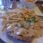 Ich hätte es wissen müssen! Das gute Vorweg. Hier werden die Schnitzel dem Anschein nach selbst geschnitten, paniert und in der Pfanne gebacken. Solo konnte das 300 Gramm Schwein auch fast überzeugen. Die Würzung war in Ordnung, gebacken war es auch anständig und nicht fettig. Vielleicht etwas dick aber es war durchgebraten und noch saftig. Hier und da eine Sehne im Fleisch, aber verkraftbar. Was gar nicht ging war die Rahm-Champignon-Soße! So was hab ich noch nicht erlebt. Ich wundere mich ja immer über die Gesichter und Aussagen diverser TV-Köche, Genussexperten und Tester und deren Urteile. Ich konnte das erste mal mitfühlen. Das war keine Soße, das war eine Frechheit. Sahne warmgemacht irgendein Pulver eingerührt, aber so wenig, das man es nur erahnen konnte, dazu ein paar Pilze rein geworfen, wohl aus dem Glas, letzte Wahl... Ging überhaupt nicht. Ich konnte es nicht essen. Hab dann das gesamte Pappzeugs runter gekratzt und das Schnitzel dann pur gegessen. Schade um die schöne Panierung. Natürlich war das kulinarische Verbrechen ja schön auf dem Schnitzel verteilt. (aber das ist ein anderes Thema)