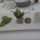 Hervorragend auch das Hummer-Potpourri; sehr schöne Hummerstücke aus Schwanz und Schere, garniert mit aus Honig- und Wassermelonern herausgestanzten kleinen Kügelchen und einem kleinen eingetopften "Sauerampferwäldchen mit Blüte". Das Töpfchen bestand aus sehr feinem Lardo und die Blumenerde darin waren kleine sehr aromatisch angemachte dunkle Mini-Linsen. Auf der anderen Seite wurde der Hummer eingerahmt von einer kleinen aufrecht stehendenLachsrolle, die mit einer sehr wohlschmeckenden weisslichen Farce gefüllt war. Eine Komponente der Füllung dürfte die in der Speisekarte aufgeführte Buttermilch gewesen sein. Wir haben diesbezüglich nicht weiter nachgefragt sondern still vor uns hin genossen. Für den Hummer beide bzw. alle vier Daumen hoch!