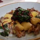 Die frischen Kartoffelkissen fluffig, mit unauffälliger Pilzfarce gefüllt. Die kleinen Pilze gut geputzt und mit feinem Aroma. Gut (nämlich kurz) sautiert der Spinat, das Ganze mit nicht zuviel Parmesan leicht gratiniert.