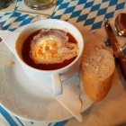 So konnten wir auch nach kurzer Bedenkzeit unsere Wünsche für das Abendessen loswerden. Als Vorspeisen entschieden wir uns für die „Bayrische Leberknödelsuppe“ für 4,80 €, ein „Feines Würzfleisch im Näpfchen mit Edamer Käse überbacken und Toast“ für 4,90 € sowie für drei Tassen „Ukrainische Soljanka mit Baguette“ für je 4,50 €. Als Hauptspeisen wählten wir einmal das „Argentinische Rumpsteak(250 gr) mit Chilibutter, Pommes Frites und Salatbeilage“ für 17,50 €, einmal den „Zarten Lammkeulenbraten gereicht mit Thymianbohnen und Kartoffelklößen“ für 12,50 €, einmal das „Schweinerückensteak au four, dazu gebutterte Erbsen und Pommes Frites“ für 12,50 €, einmal die „Forelle Müllerin Art mit Mandelbutter und Petersilienkartoffeln“ für ebenfalls 12,50 € und zweimal orderten wir noch die „Gepökelte Rinderzunge mit zerlassener Butter, Erbsen und Petersilienkartoffeln“ für je ebenfalls 12,50 €.