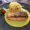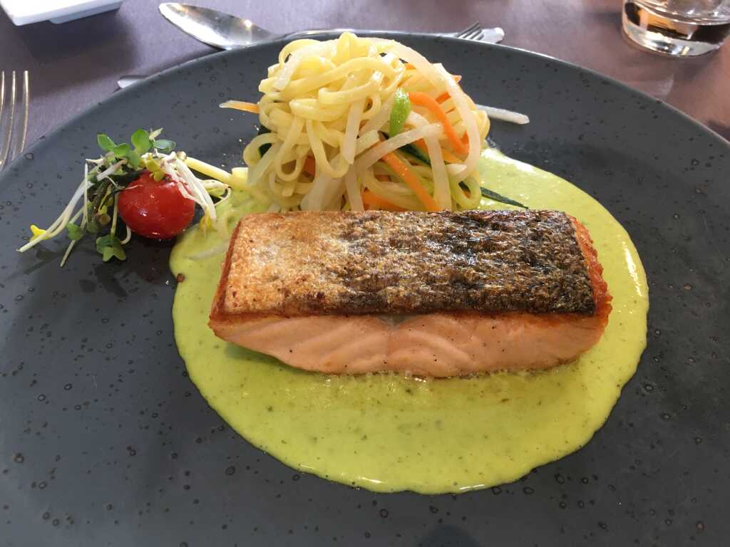 Der Lachs war auf der Haut gebraten. Die Oberfläche war fein knusprig. Bei Lachs ist die Haut oft nicht schmackhaft; hier hat sie mir sehr gut geschmeckt. Das Fleisch war saftig und locker und genau im Gargrad getroffen.