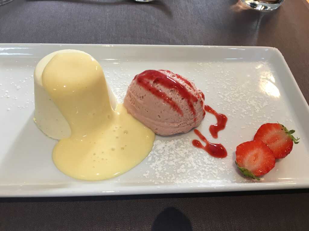 Beide Zutaten waren gut gemacht und schmeckten prima. Das Himbeergericht war locker und cremig. Das Eis war gut zu löffeln und die Vanille-Sauce obenauf rundete den Geschmack gut ab. Die Erdbeerstücke waren süß und saftig.