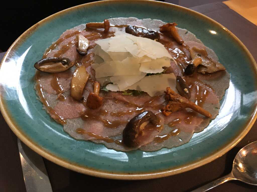 Kalbscarpaccio mit marinierten Waldpilzen an Rucola und gehobeltem Parmesan