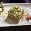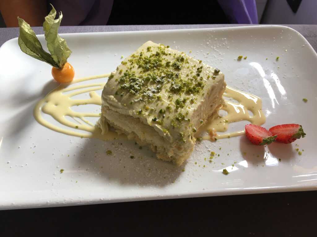 Das war ein richtig großes Paket. Die Biskuitböden waren nicht zu dick und schön getränkt. Mit der Creme war großzügig umgegangen worden. Und obenauf waren noch mehr Pistazienstücke.