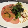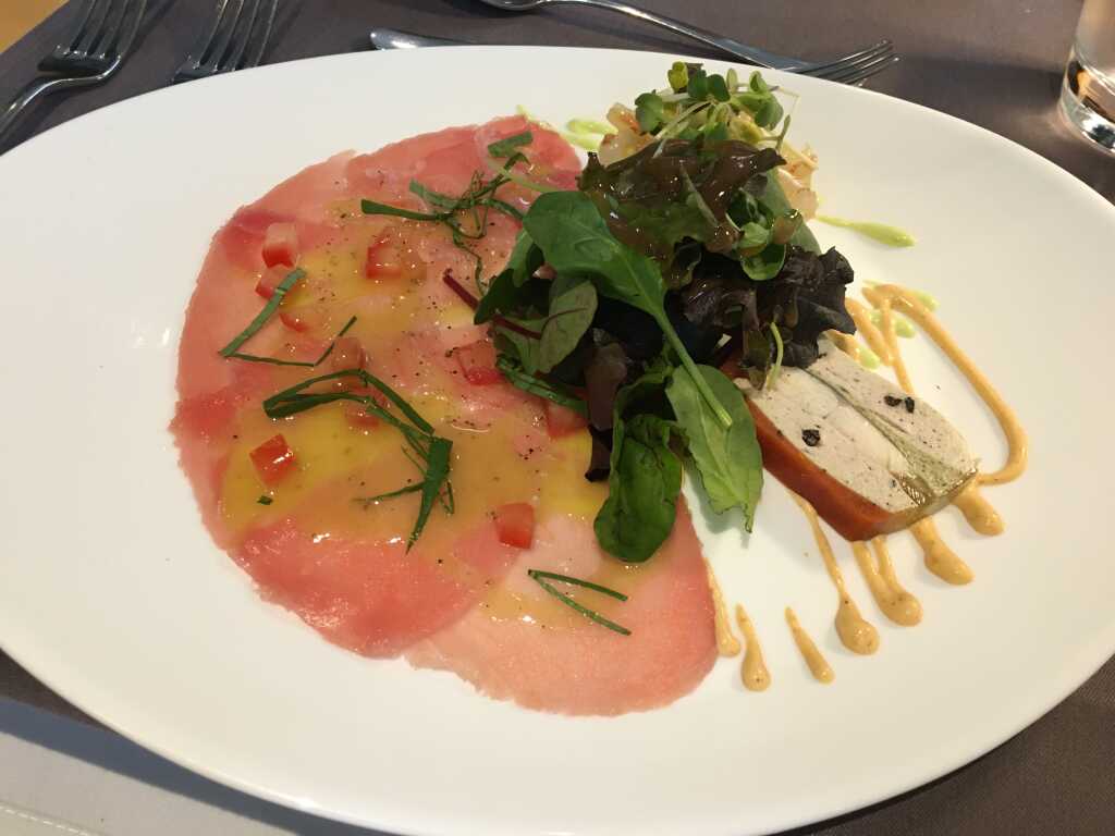Der Teller sah gut aus – und schmeckte sogar noch besser. Drei verschiedene Meeresgerichte erfreuten den Gaumen. Jede Abteilung zeigte unterschiedliche Aromen. Besonders schmackhaft waren die Stücke von der Zander-Terrine.