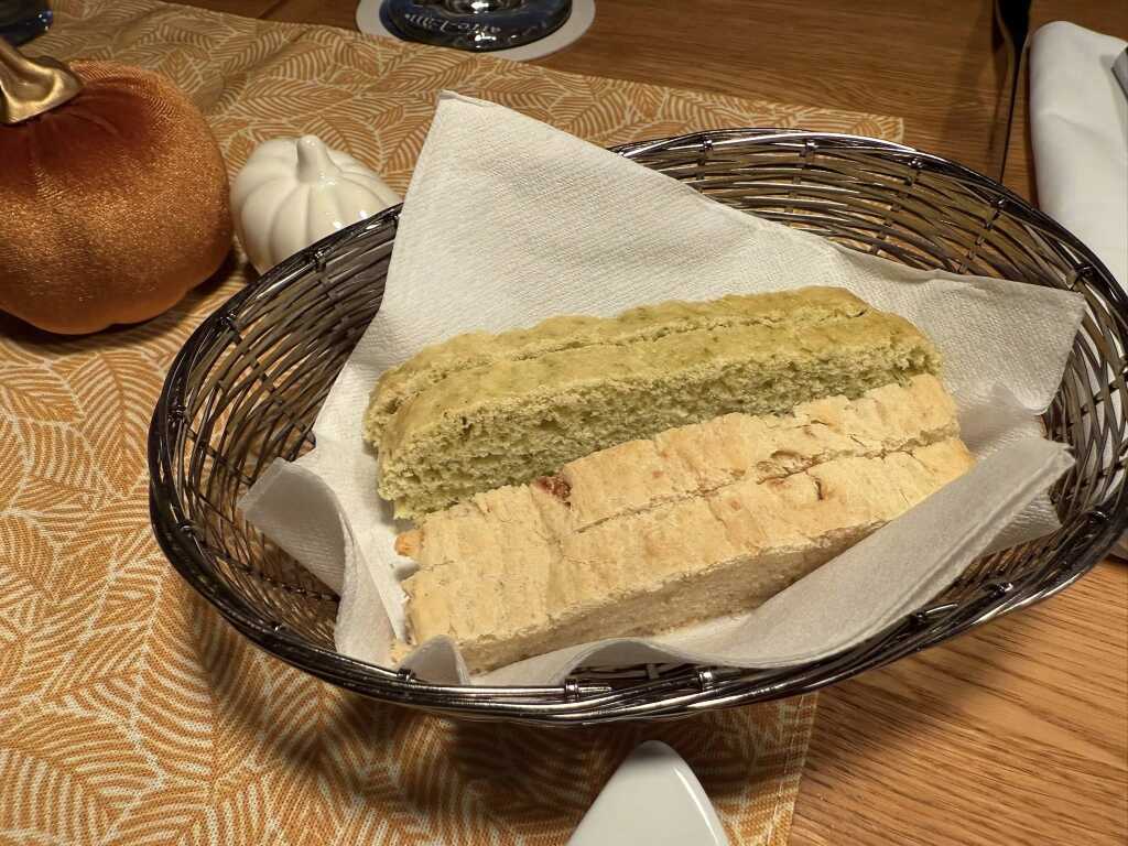 Erst ein Körbchen mit selbstgebackenem Bratkartoffel - Zwiebelbrot und Kräuterbrot ,mit einem Töpfchen Kräuterquark.War schon gut.