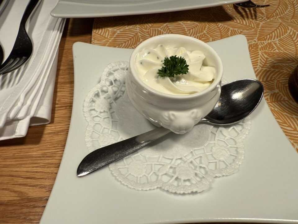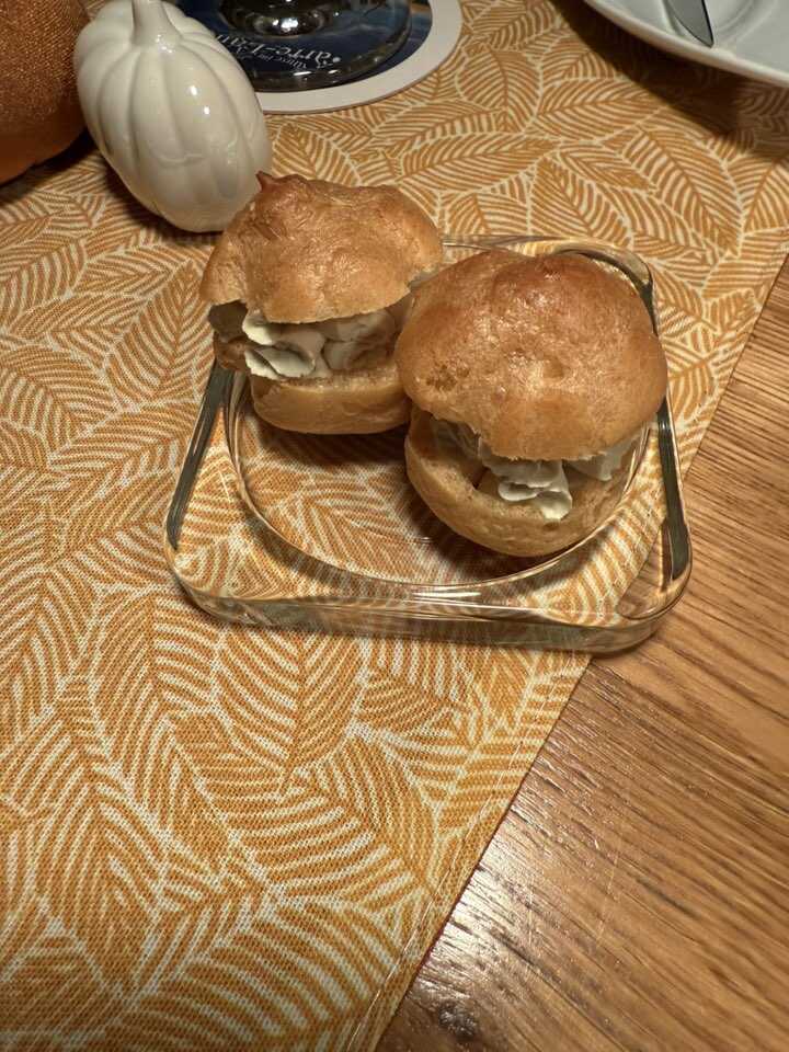 Kurz darauf,bekamen wir noch jeder,einen Mini-Windbeutel mit Kräuterfrischkäse und Kürbiskernöl,gefüllt.
