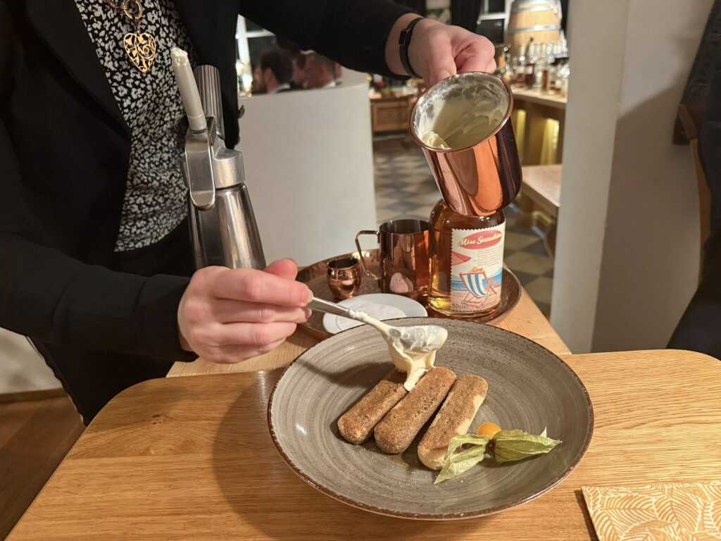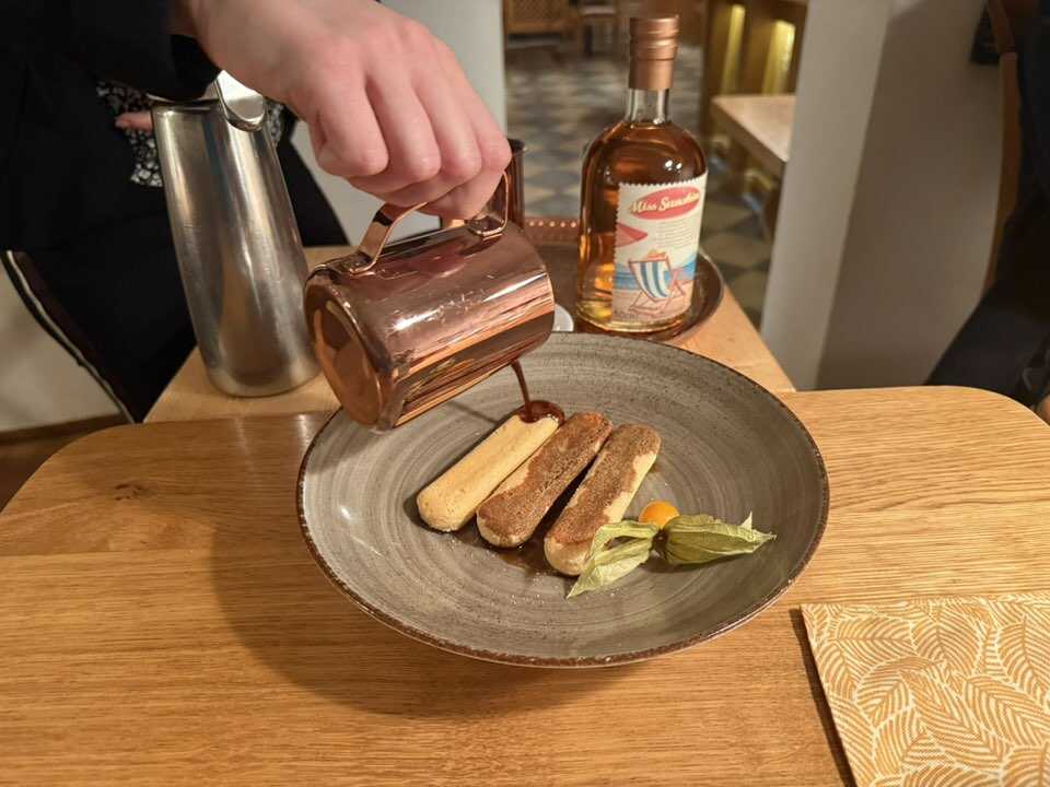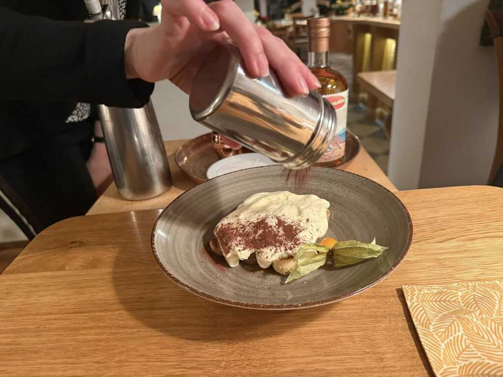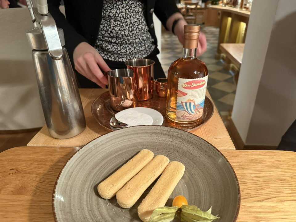 Das Tiramisu,wurde am Tisch zubereitet und es war mit einem sehr ordentliche Schuß " Miss Sunshine " Whiskey,der 40% hat,verfeinert. Dazu kam dann noch Mascarpone , Espresso und Sahne.