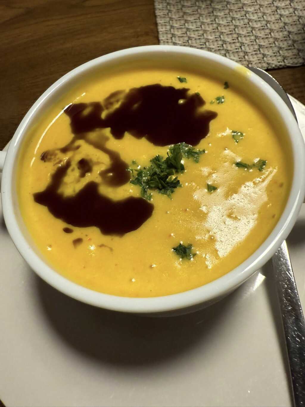 Bei der Vorspeise,waren wir uns einig und nahmen die Kürbissuppe mit Kürbiskernöl,zu 6,90 Euro.