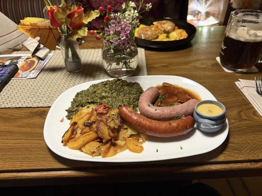 Die Bratkartoffeln ordentlich mit Speck und knusprig, Eine gute Portion Grünkohl und dazu eine frische Kohlwurst,Rauchende und eine Scheibe Kasslernacken. Dazu noch ein Töpfchen,Senf.
