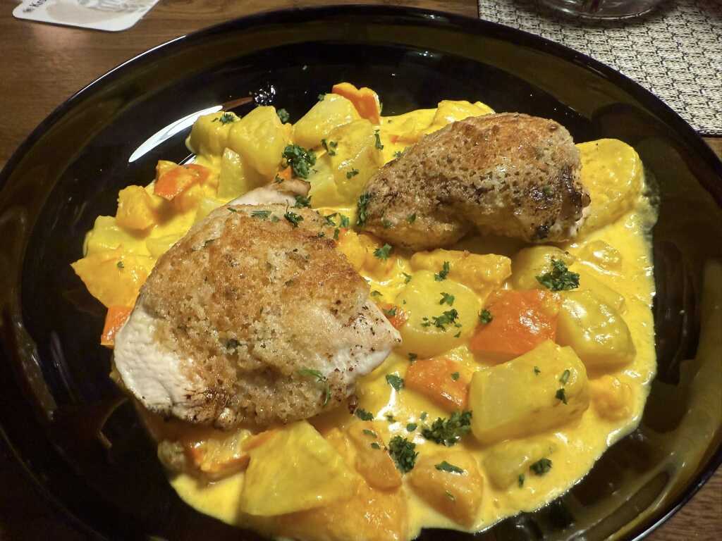 Boah,war das lecker. Das Hähnchen richtig saftig,was ja immer so ne Sache ist, Die Panade mit ordentlich viel Kräuternversehen und dazu diese Ragout. Di e Kartoffeln und Kürbis,waren noch stückig und richtig schön schlotzig,eingekocht. Herrlich cremig. Auch diese Variante,habe ich bisher,noch nicht gegessen. Abere gut. Sehr gut.