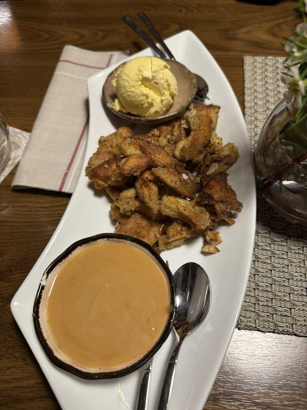 Auch Kaiserschmarrn habe ich so noch nicht gegessen. Er war mit Mandeln statt Rosinen,was jetzt nicht mehr so außergewöhnlich ist. Allerdings der gesamte Geschmack ,ich weiß nicht wie ich es beschreiben soll. Anders,aber sensationell und total fluffig.Dazu das Vanilleeis und diese Caramel Sauce. Männe hat nur mal probiert,aber den Rest Caramell Sauce,noch gelöffelt.Er sagte später,hätte er gewusst,dass der Schmarrn so lecker ist,hätte er sich doch einen bestellt.