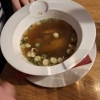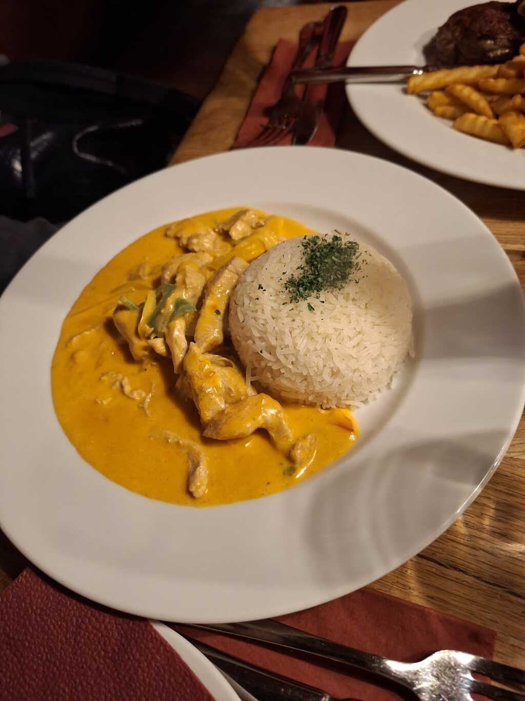 Die Suppe war jetzt nicht groß in der Portion und leider war sie auch nur lau warm. Für uns sollte eine Suppe heiß sein. Das man den Löffel bereits in der Suppe bekommt ist uns auch neu, war halt so. Etwas frischer gehackter Koriander befand sich als sagen mal Deko mit drauf. Hühnerfleisch war in kleineren Stücken dezent vertreten und es war auch noch saftig. Indische Hühnerfleischsuppe hieß es , was daran Indisch sein sollte erschloss sich uns nicht. Hier denken wir immer an eine Gewürzvielfalt an orientalischen Gewürzen. Wir hätten sie jetzt eher Knoblauchsuppe genannt. Dieser war ein wenig vertreten. Sie war cremig, etwas Curry Geschmack kam für uns durch , aber sonst war nicht viel dabei. Da hatten wir die anderen Suppen die wir hier schon gegessen hatten anders in Erinnerung vom würzen her. Beim jetzigen nachlesen war es auch so.