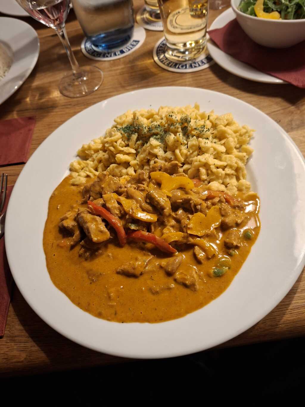 Diesmal waren wir vom essen nicht so zufrieden wie beim ersten Besuch. Fast kalte suppe und kalter reis sind nicht unser fall. Schön wäre gewesen wenn wir für das Butter Chicken auch eine Wärmeplatte bekommen hätten wie , sagen wir mal die Stammgäste, dann wäre es während des Essens noch schön warm geblieben. Geschmacklich war es aber sehr gut. Diesmal entscheiden wir uns für 2,5 Sterne