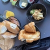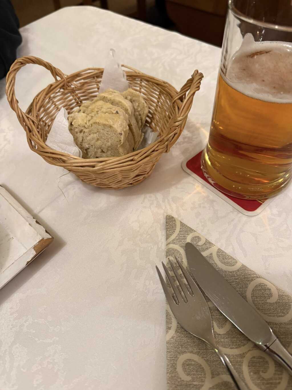 Die war richtig gut. Schön heiß und mit ordentlich Kräutercroutons,drin. Dazu gab es ein Körbchen,mit ein paar Scheiben Baguette.
