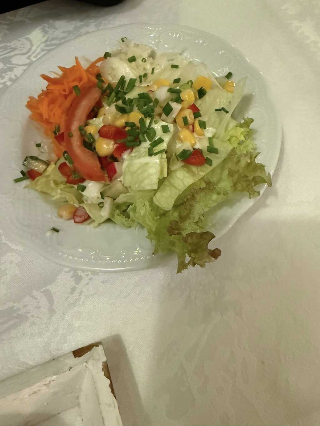 Es hat ihm alles sehr gut geschmeckt.Der Salat,war mit Essig und Öl angemacht und schön frisch.