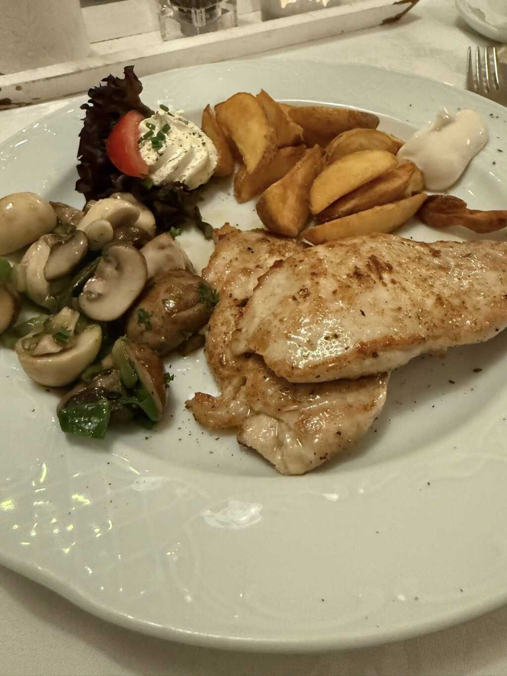 Er war schwer begeistert. 2schön dünn geklopfte Schnitzel,vom Duoc- Strohschwein und geschmacklich,sehr gut.Dazu gab es gebratene Champignons, Kroketten, hausgemachte Sauce Hollandaise und 1 kleiner gemischter Salat.