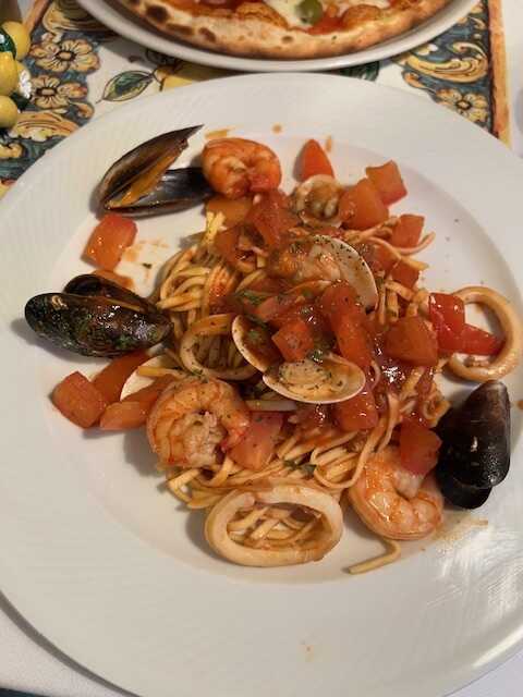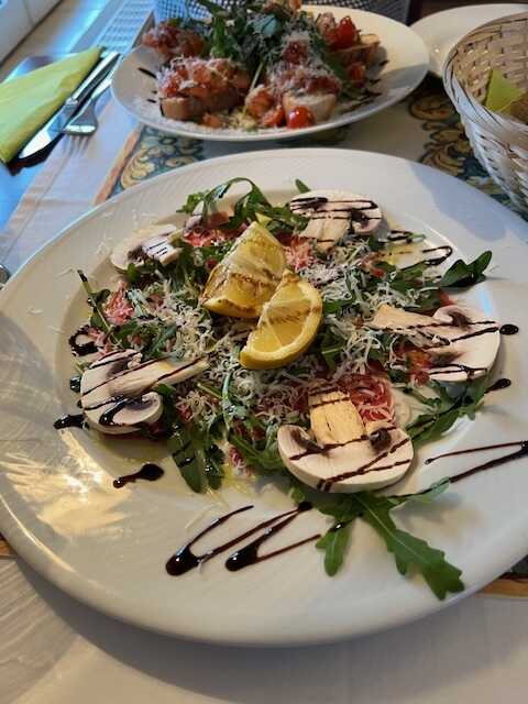 Ich hatte mir schon online Carpaccio di Manzo (20 Euro), Bruschetta (8 Euro) und eine Pizza Etna (15,50 Euro) ausgesucht. Meine ständige Begleiterin wählte die Pasta del Porto (22,00 Euro) als Hauptspeise.