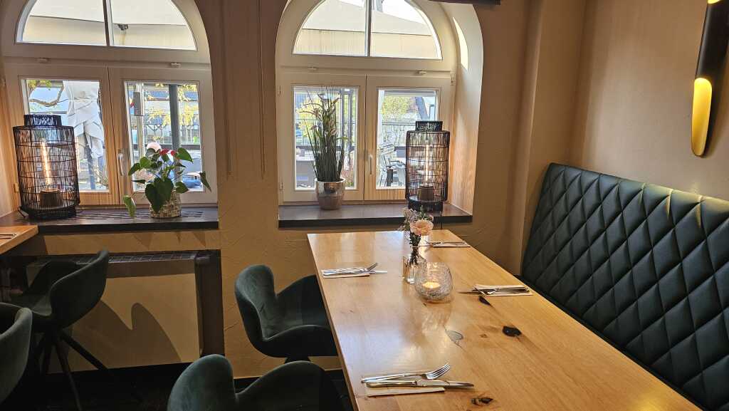 Der große Gastraum ist sehr gepflegt und modern, aber auch gemütlich gestaltet. Frische Blumen auf dem Tisch, einfach und schön.