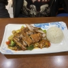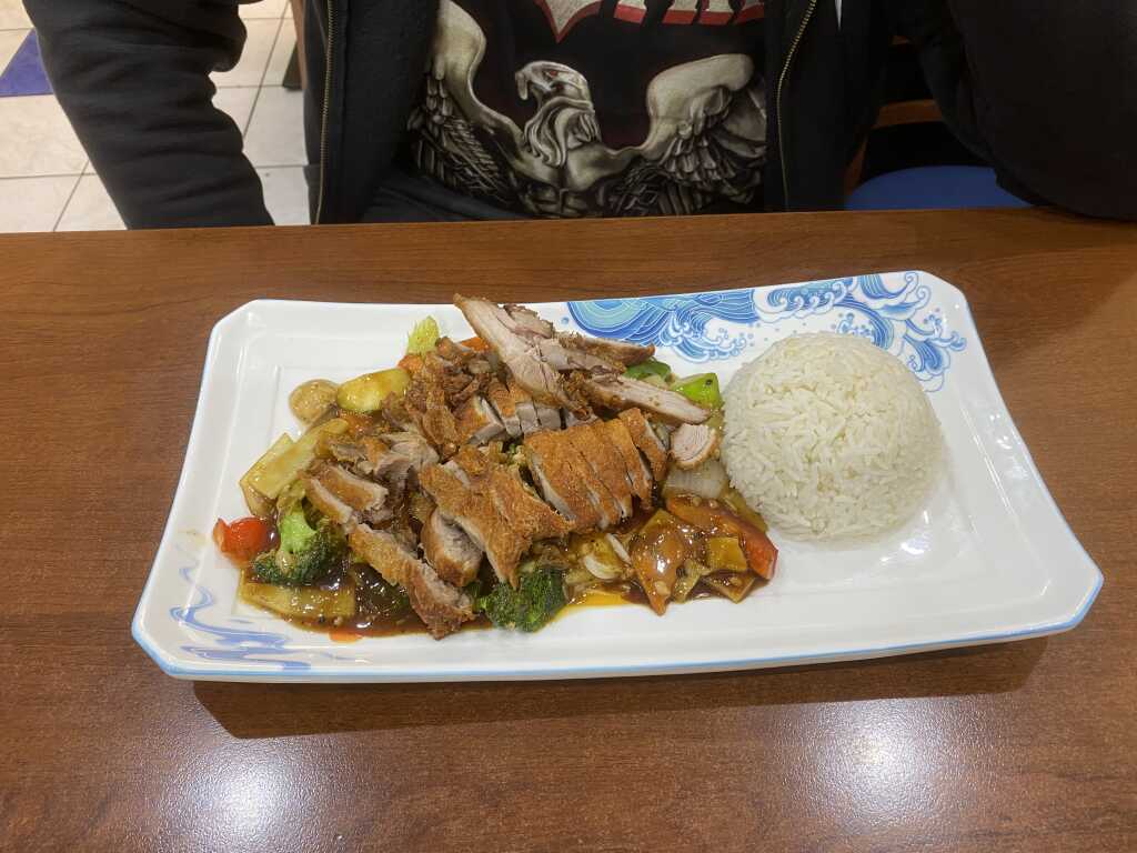 Spotzl wählte diesmal knusprige Ente mit Gemüse in Sa-Cha-Soße für 13.- € Der Reis war halt wie immer – Reis halt, aber er war heiß. Die Ente saftig, zart, schmackhaft und mit knuspriger Haut. Als Gemüse gab es Gelberüben, Brokkoli, Paprika in verschiedenen Farben, Blumenkohl, Bambussprossen, Champignons, Zwiebeln und eine Gemüsesorte die wir nicht so richtig zuordnen konnten. Wir tippen auf eine spezielle Zuchini Art. Es war von einem rundlichen Gemüse raus geschnitten worden, hatte eine hellgrüne Schale und innen etwas Kerne. Schmeckte irgendwie nach Zuchini, aber mit mehr Geschmack danach. Das Gemüse war alles frisch, auf den Punkt gegart und mit noch etwas Biss. Die Soße war schön würzig abgeschmeckt worden mit einer dezenten schärfe in sich. Asiatischer Geschmack incl. Sojasoße kam gut durch.