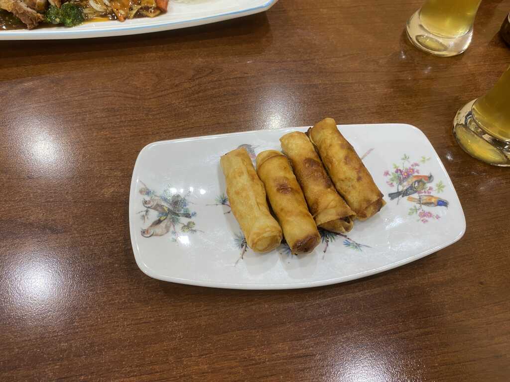 Ich entschied mich wieder für die Frühlingsrollen ( 4 Stück) für 4,50 € . Im Preis haben sie sich seit 2022 nicht viel erhöht. Immer noch lecker, knusprig frittiert, nicht fettig und geschmacklich gut. Diesmal gab es nur frisches Weißkraut und Gelberübenstreifen mit drinnen. Die Pilze fehlten. Die gröberen Hühnchenstückchen sind noch vorhanden und diese waren auch nicht zu trocken. Zum Dippen gibt es die üblich bekannte Sweet-Chili –Soße, die wie immer in der Flasche auf dem Tisch steht.