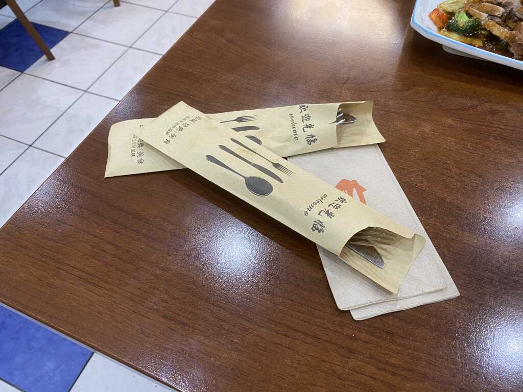 Das Besteck gibt es mittlerweile in einer Papiertüte und Servietten dazu