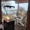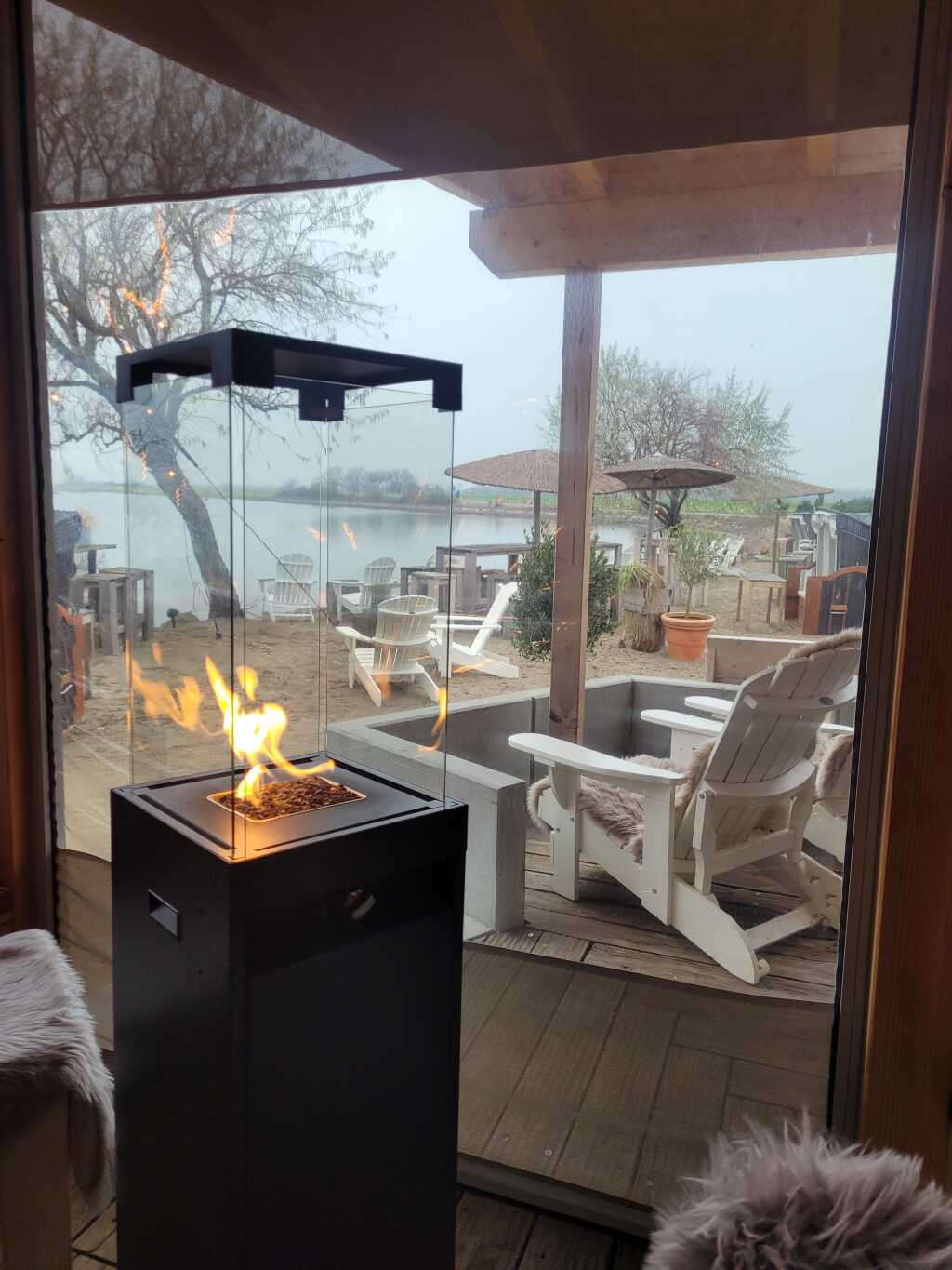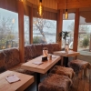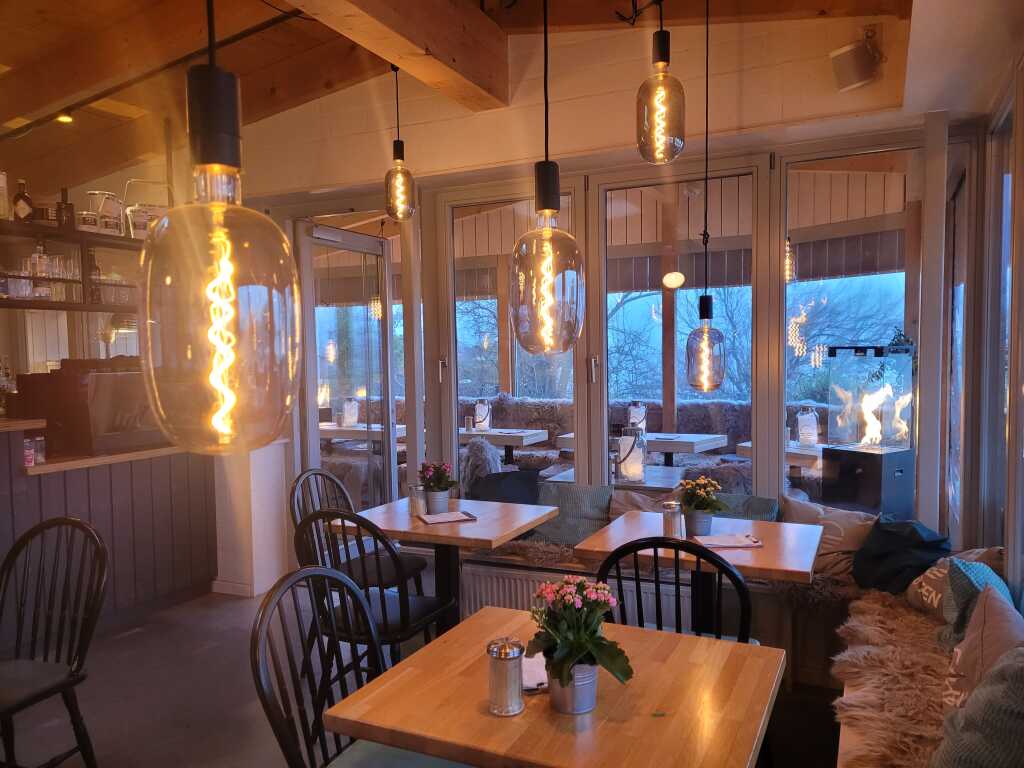 Wir wurden von zwei jungen, sehr freundlichen Damen begrüßt, und nahmen im Gastraum an einem der großen Fenster Platz. Von hier aus hatten wir den besten Blick über das kleine Bistro als auch auf die Ostsee. Mit Gas befeuerte Kamine gaben dem Raum eine wohlige Wärme. Die modernen, großen Tische bieten ausreichend Platz für Speisen und Getränke, auf den Stühlen mit einem weichen Sitzkissen sitzt man ganz gemütlich. So lässt es sich aushalten.