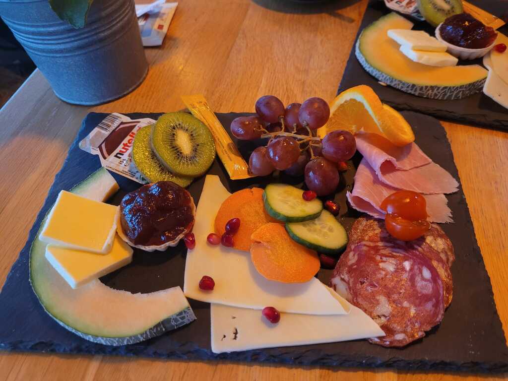 Eine knappe viertel Stunde mussten wir auf unser Frühstück warten, aber was uns dann serviert wurde ließ die Augen erst mal leuchten. Auf einer schweren Schieferplatte wurde das herzhafte Frühstück serviert. Die Freundin meines Fehmarnschen Sonnenscheins und auch ich hatten uns für das herzhafte Club Breakfast entschieden.