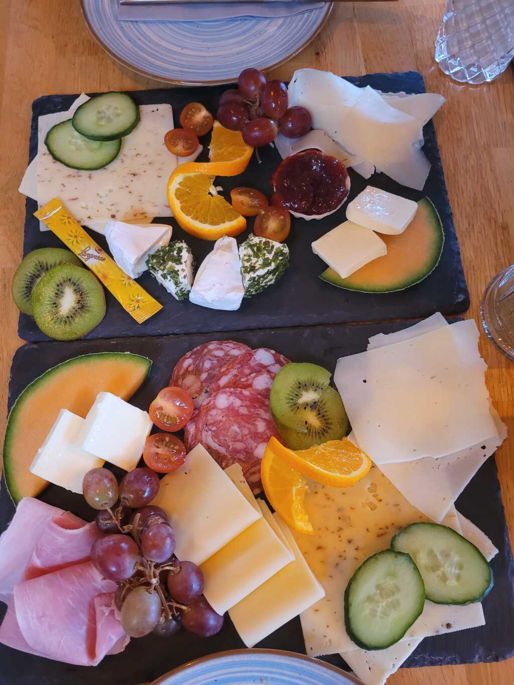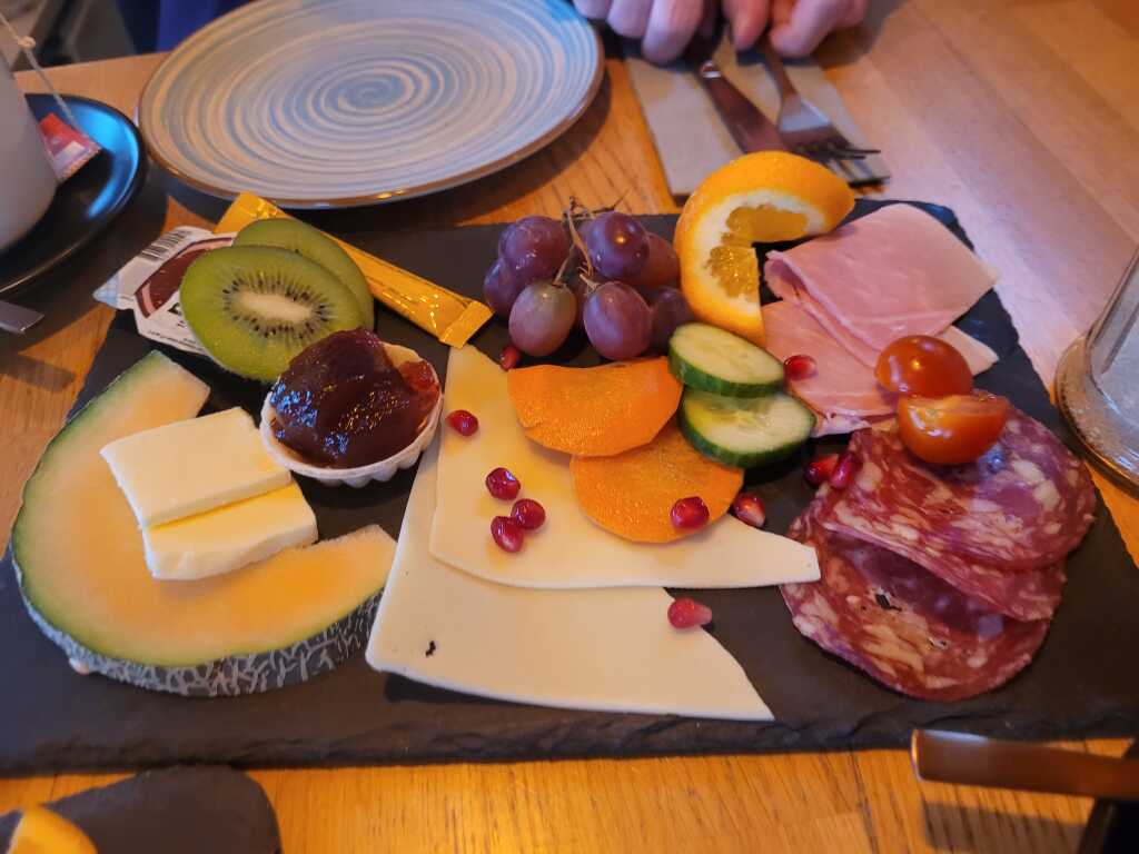 Meine Frau entschied sich für das Käse Frühstück mit Pecorino, Bergkäse, Camembert, Frischkäse, Kräuterkäse und Marmelade. Auch hier gab es statt dem Frischkäse den Gouda als zusätzliche Option. Auch sie war zufrieden mit ihrem mehr als reichlichen Frühstück.