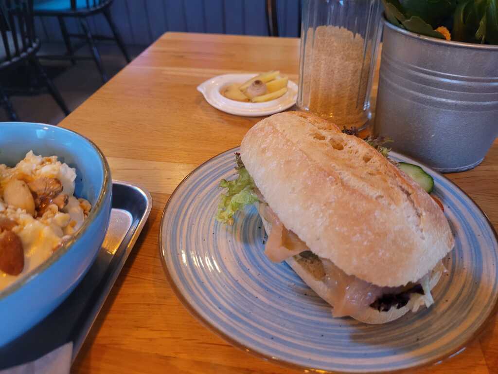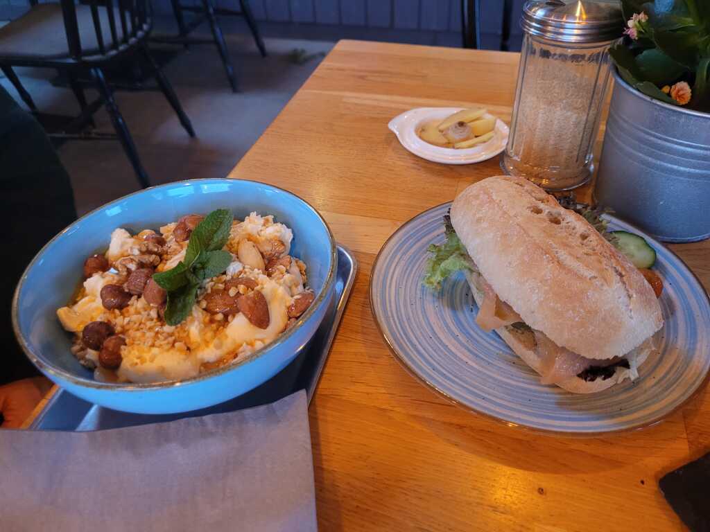 Schon die große Schüssel mit dem griechischen Joghurt machte ja schon fast satt. Das große Baguette Lütten Lachs war mit reichlich Lachs, Salat und Ei belegt, die drei Pancakes vollendeten das Frühstück. Ich glaube an diesem Tag gab es außer dem ein oder anderen Verdauerli nichts anderes mehr.