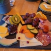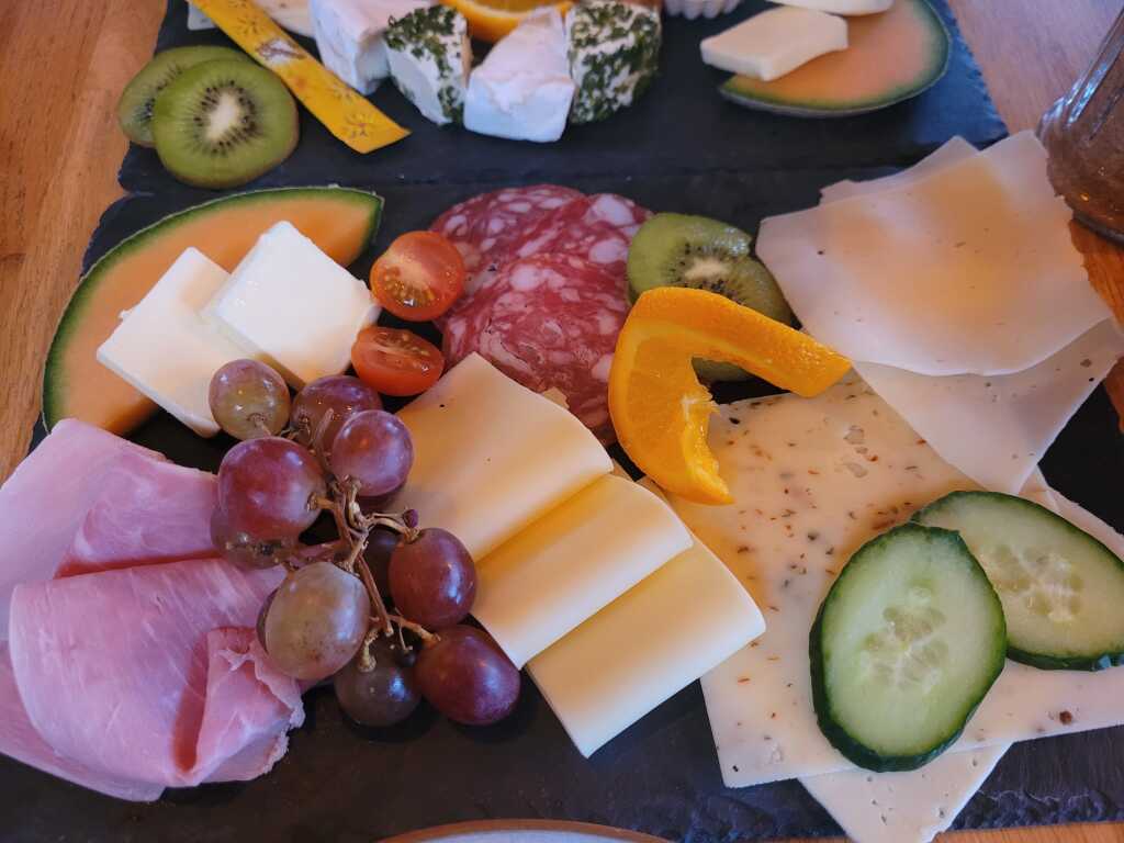 Weiterhin gab es in einer kleinen Pappschale Marmelade, Nutella in der Portionsverpackung sowie auch Honig in der Portionsverpackung. Ich gab das süße Zeugs an meine süßen Mädels weiter, und erhielt im Tausch etwas Käse sowie Salami. Kein schlechter Tausch. Als Dekoration gab es zum naschen noch dunkle Trauben, frische Kiwi und Honigmelone.