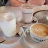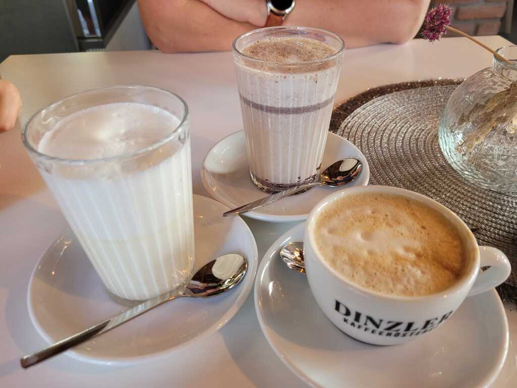 Der leckere Milchkaffee , Cappuccino und Latte macchiato versöhnten uns etwas mit der Enttäuschung über den Kuchen .