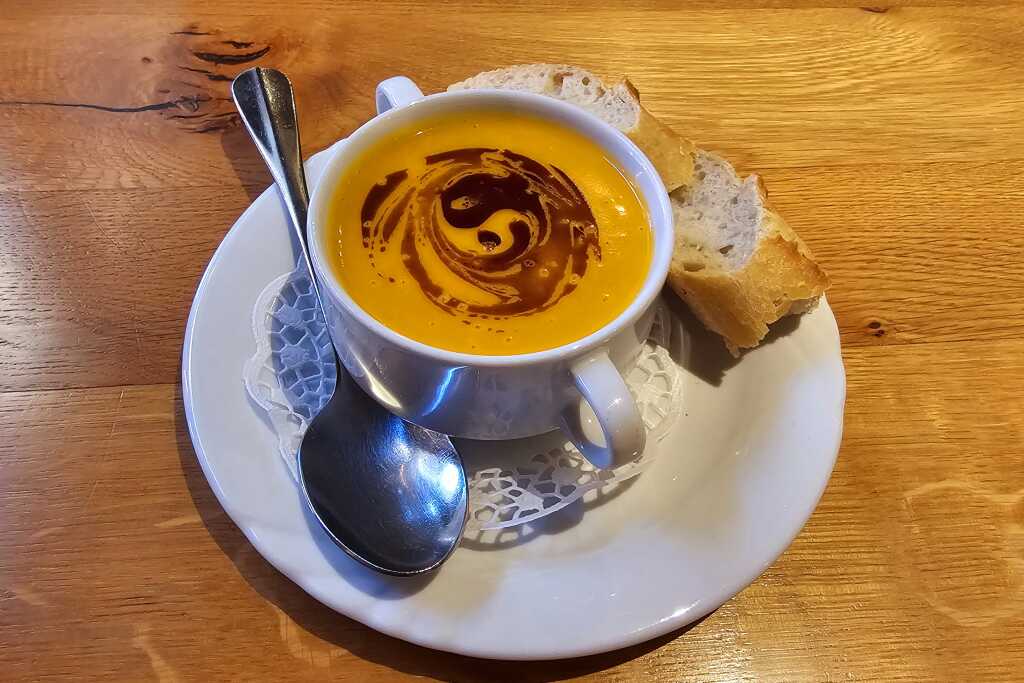 Mein Mann hatte sich für die herbstliche Kürbissuppe vom Hokkaido mit Kürbiskernöl zu € 6,90 entschieden.