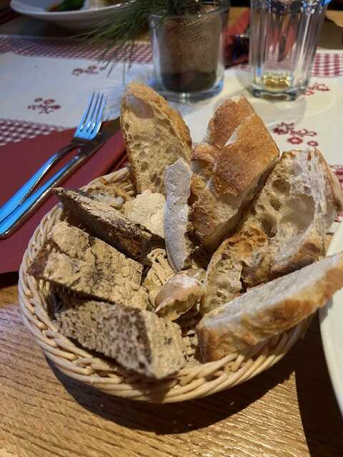 Schon beim Studium der Karte fiel mir im Vergleich zu meiner Kritik aus 2018 auf, dass sich die Küche mehr an italienischen Standards orientiert wie z. B. Vitello Tonnato; geopfert wurde z. B. der Luis-Trenker-Teller mit Maccheroni und Speck. Auch das Personal hat die Tracht abgelegt. Restaurantleiter Matyas Insam nun im weißen Hemd und schwarzer Hose und seine Crew sah ich in schwarz gewandet. Ich bedaure das, denn die Trachten passten perfekt zum Hüttencharme, den ich 2018 ausführlich beschrieben habe.