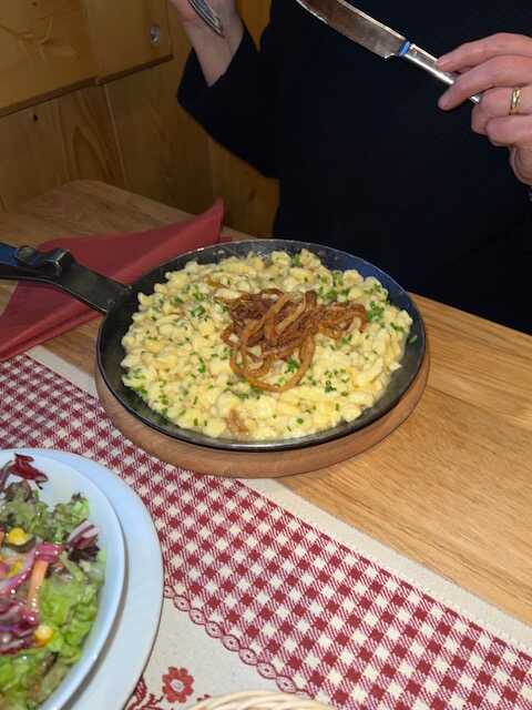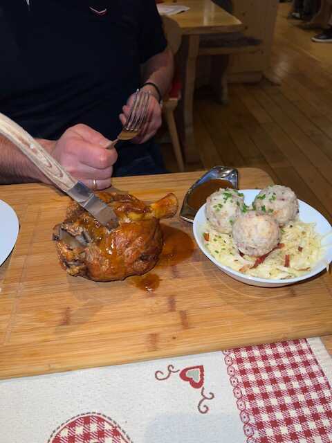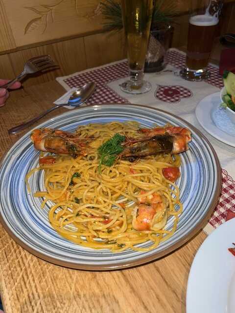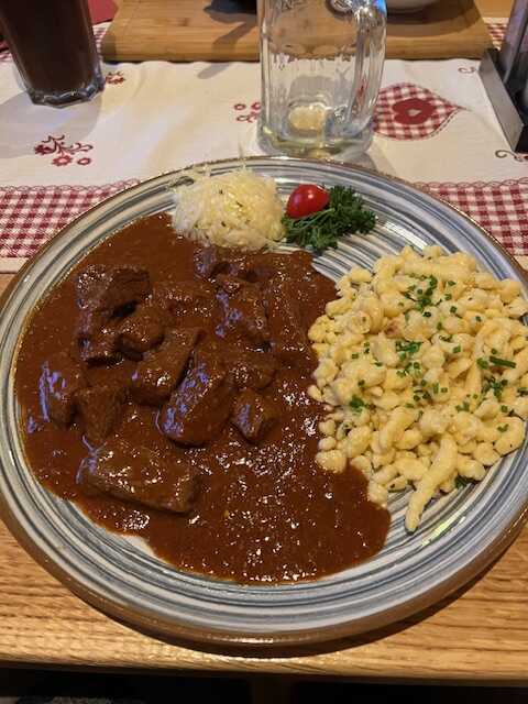 Alle Gerichte waren schmackhaft. Als da waren die Speckknödel in kräftiger Rindsbrühe, die sehr kräftige Tomatensuppe (9,80), mein Gulasch mit Spätzle (27,40), Spaghetti Aglio Olio mit drei großen Gambas (23,80), Käsespätzle (21,50) und die Schweinshaxe als Tagesangebot (26,00).