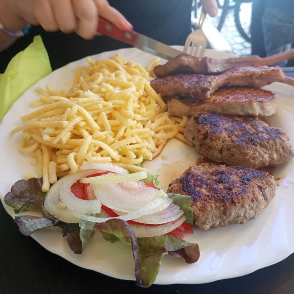 Für 23 Euro wurde noch der Athen-Teller bestellt, der besteht aus 2 großen Cevapcici, 1 Schweinefilet und 2 Lammkoteletts. Auf dem Teller noch ein bisschen Salat und Zwiebeln. Tzatziki war nicht dabei. Auf Nachfrage kam er auch nicht. Wahrscheinlich hat die nicht griechische aber auch nicht deutsche Bedienung es vergessen oder sie hat es nicht verstanden. Denn schon bei der Beilage gab es Missverständnisse. Das Fleisch war aber gut.