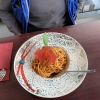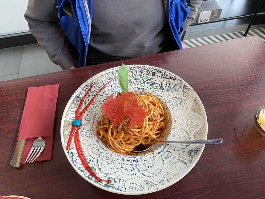 Die Nudeln waren diesmal eine Klasse Wahl. Die Spagetti auf den Punkt al dente gekocht worden. Sie kamen schön heiß an den Tisch. Sie wurden auch schön in Salzwasser gekocht, ein träumchen . Was das oben drauf war können wir nicht sagen, außer das Blättchen frischer Basilikum. Raus geschmeckt haben wir nichts und das geschreibsel mit dem blauen Punkt am Rand ergab für uns auch keinen sinn, schmeckte für uns nach nichts. Allerdings die Bolognese Soße hatte einen Klasse Geschmack. Schön tomatig schmeckend, würzig, kräftig abgeschmeckt. Das Gemüse in feine Würfel vertreten und ausreichend Hackfleisch mit drinnen. Sie war auch nicht zu flüssig. Wir waren begeistert, Nudeln können sie, gerne wieder.