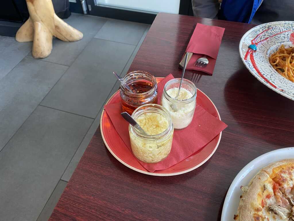Wir bekamen einen Teller auf dem sich drei Gläser befanden. Einmal ein Chiliöl. Das hatte Flocken von der Chili mit drinnen, auch die Samen und ordentlich wums, hat uns gefallen. Auch das Knoblauchöl, klasse versehen mit Knoblauchwürfeln, so mögen wir es, wenn auch Geschmack vorhanden ist und ein Vampir drei Tage nicht kommt. Dann gab es noch Parmesan der feiner gerieben war und keinen schlechten Geschmack hatte.