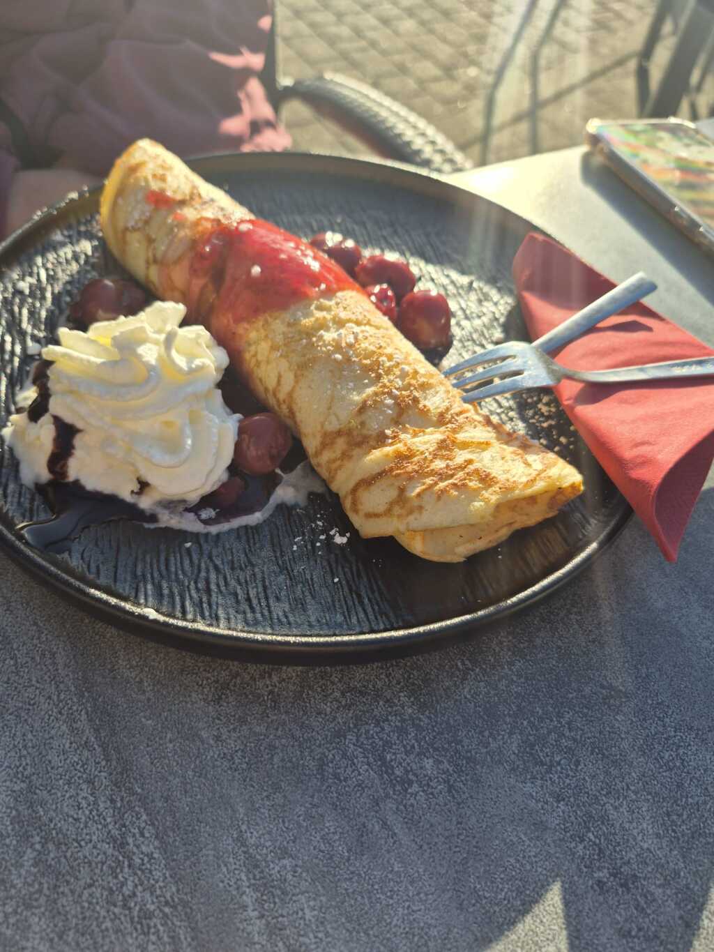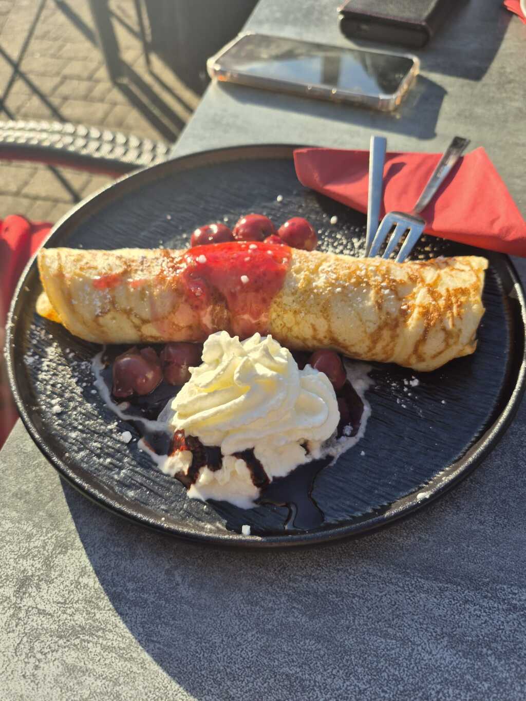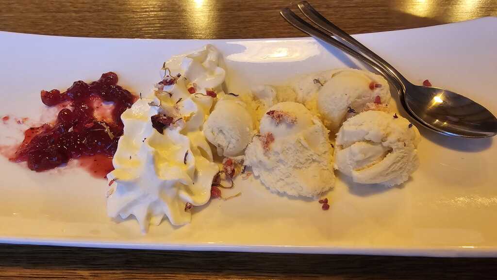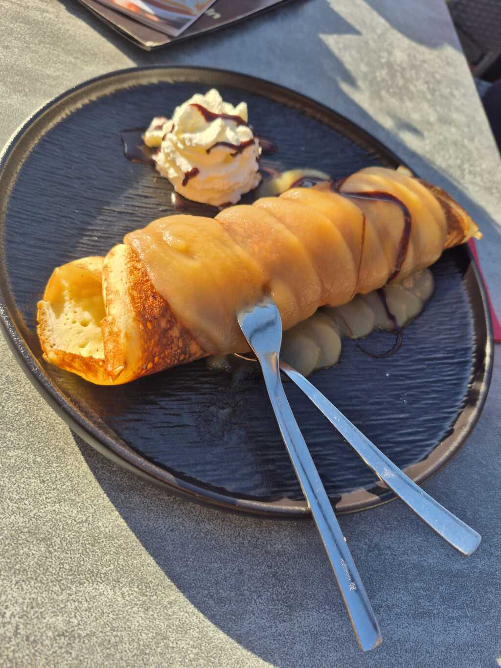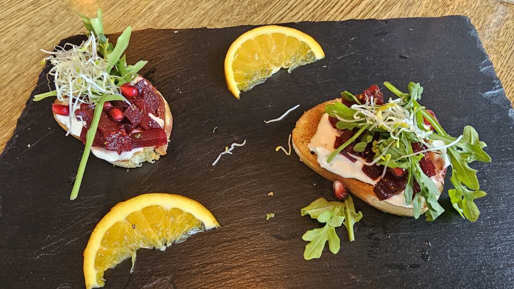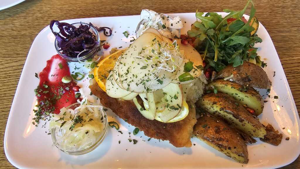Im Fleischhauptgang folgt ein Duo von mariniertem Flanksteak und Rinderfilet mit Kräuterkruste. Die auf den Punkt gegarten Gemüse (Kohlrabi, Brokkoli, Champignons und Tomate) sind fein gefächert bzw. tourniert; die Reiskrokette (mariniert und paniert) passt perfekt dazu. Die Fischvariante kombiniert Skrei auf Spinat mit karamellisierten Scampi und Kurkumaschaum, begleitet von Tomaten und Champignons. Den krönenden Abschluss bildet ein feiner vietnamischer Eiskaffee mit einem Parfait aus Feigen und Matcha.