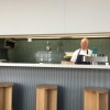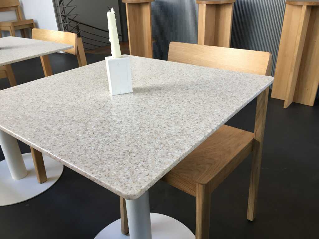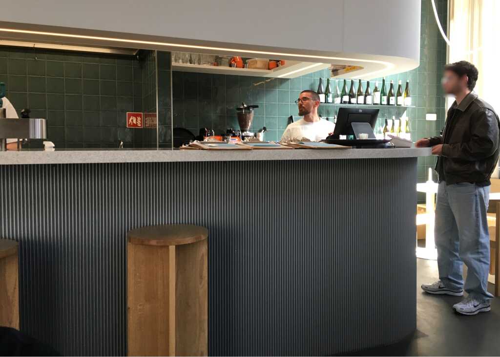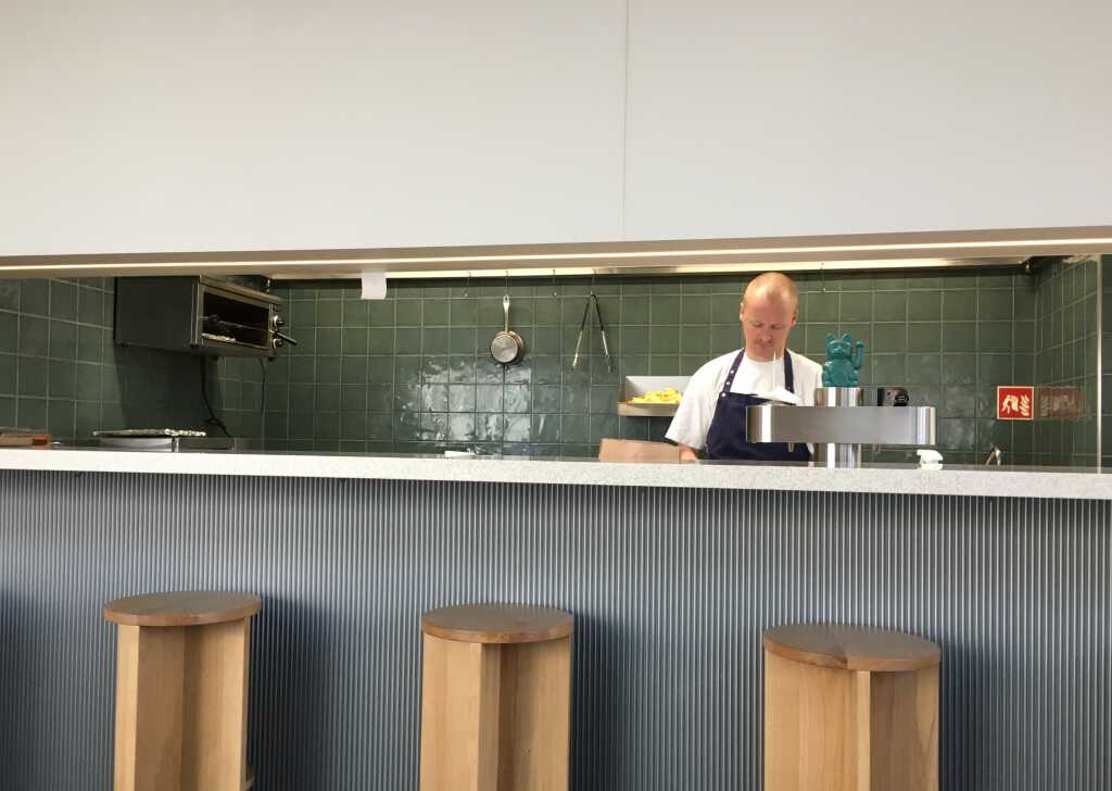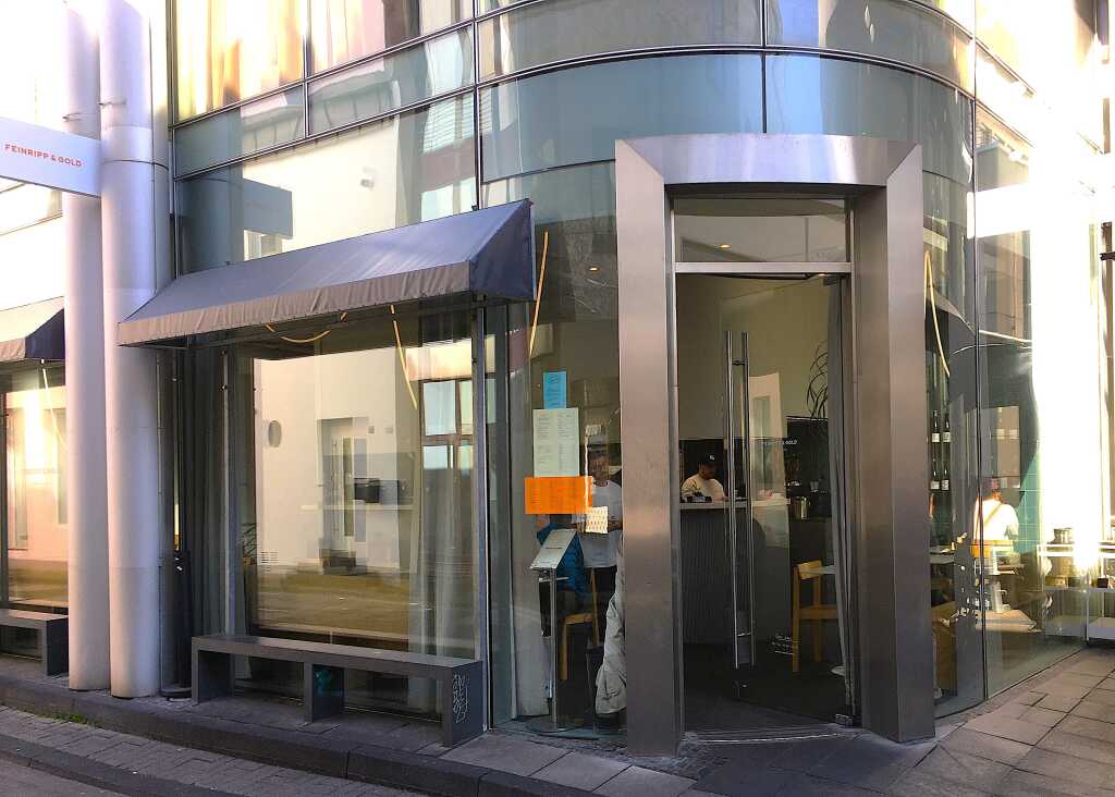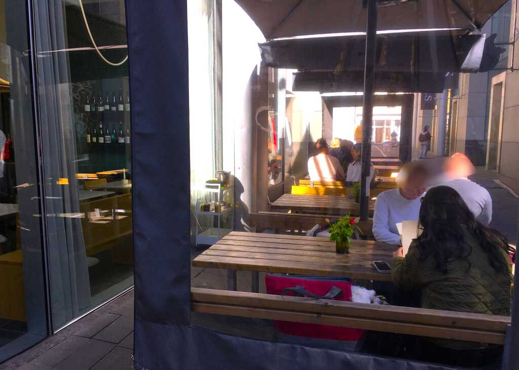Ich ging kurz ein paar Stufen ins Haus um eine Person im Rollstuhl anzukündigen. Eine ausgesprochen freundliche Bedienung war sofort zu Stelle und machte an der Glasschiebetüre zur Terrasse Platz, so, dass meine Frau entspannt ebenerdig herein konnte. Und genau den Tisch nahmen wir dann auch gleich in Beschlag.