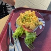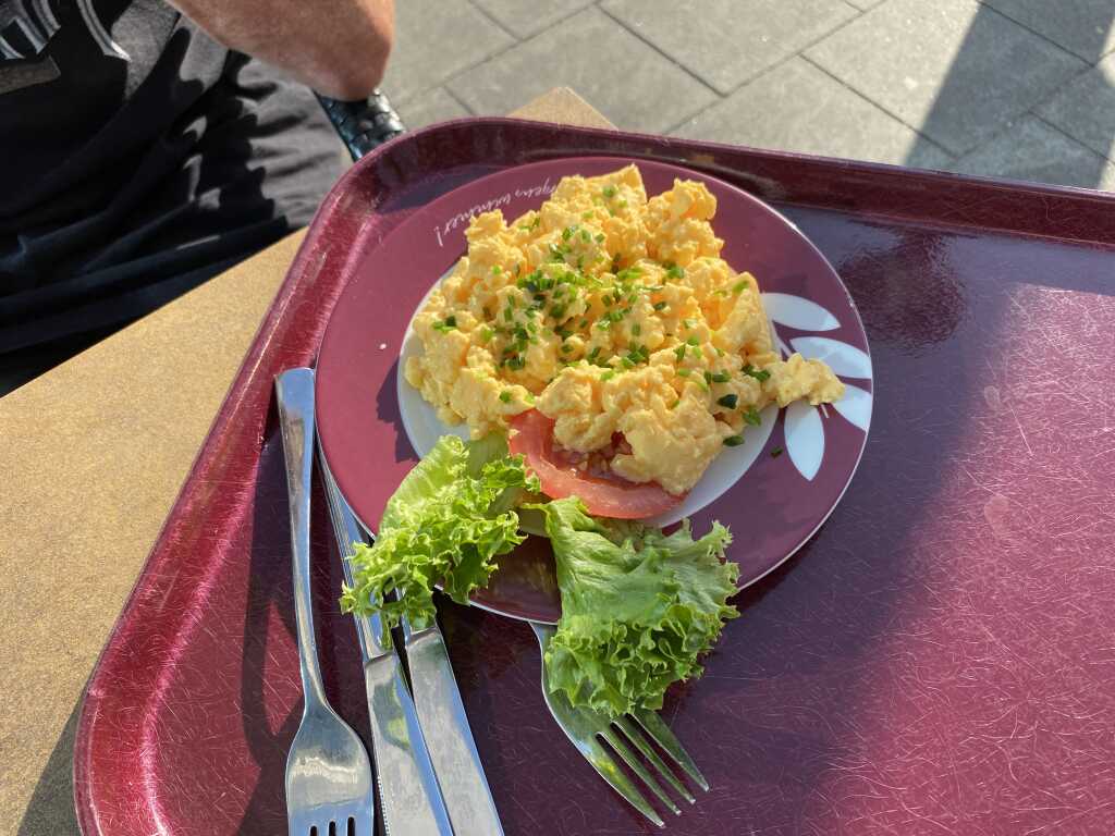 Das Rührei würden wir mal vermuten ist vorbereitet und liegt in einem Wärmebehälter so wie man es von einem Büffet kennt und wird bei Bestellung raus gelöffelt. Es war schneller am Ende des Tresen als wir und von warm sein sind Meilen weg gewesen. Bestreut war es mit etwas frischen Schnittlauchröllchen und das war auch die einzige würze an dem Ei. Auch ein deutsches Freilandei könnte etwas Salz und Pfeffer vertragen. Es war jetzt nicht so unser Fall für ein Rührei. Als Deko gab es etwas Lollo Biondo und eine Scheibe sehr reife Tomate.