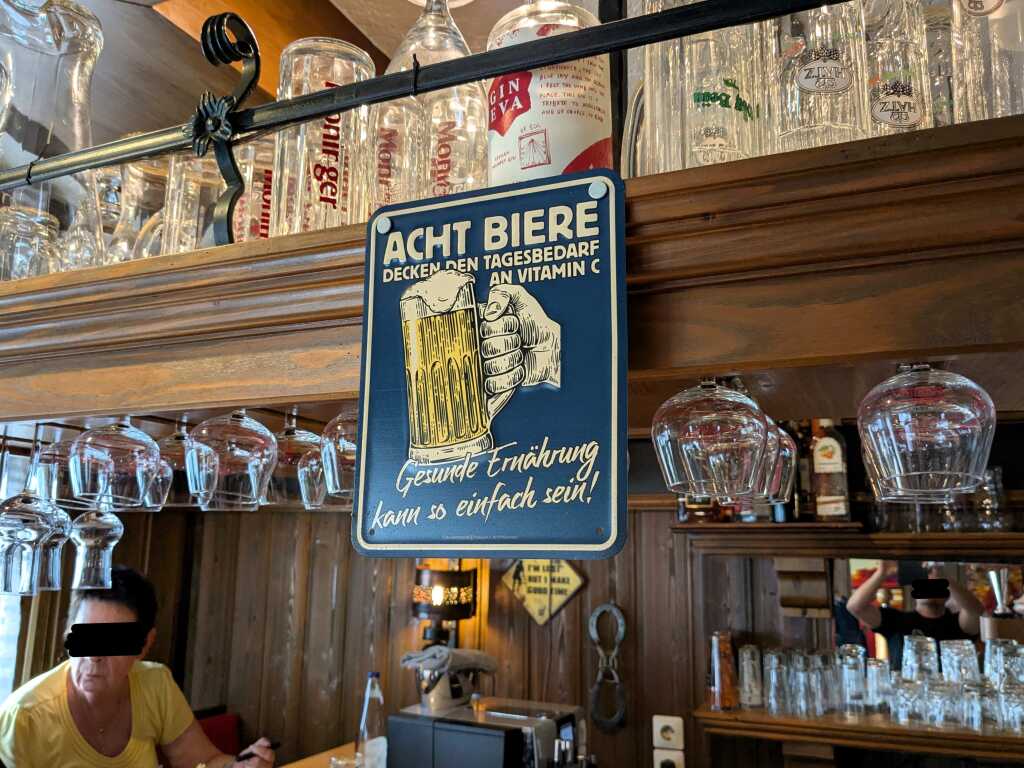Überraschenderweise wurde mir vom anfänglich etwas mürrisch wirkenden Patron doch tatsächlich ein Platz an der Theke gewährt. An jener saß ich zum ersten Mal und ein über ihr angebrachtes Schild mit der These, dass acht Schoppen Bier den täglichen Tagesbedarf an Vitamin C komplett abdecken würden, beruhigte den nach wohlgehopfter Isotonie dürstenden Radfahrer in mir.