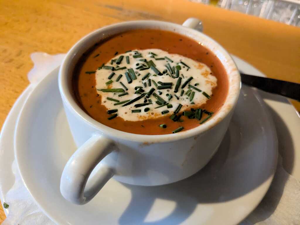 Keine Ahnung, warum ich die Portionsgröße von damals nicht mehr warnend im Hinterkopf hatte als ich vorweg noch eine hausgemachte Tomatensuppe mit Sahnehaube (5,50 Euro) orderte. Aber ein Wörther Pedalritter kennt ja angeblich sein Magenvolumen. Und das süffige Hatz-Pils schürte ohnehin weitreichende Appetitfantasien.