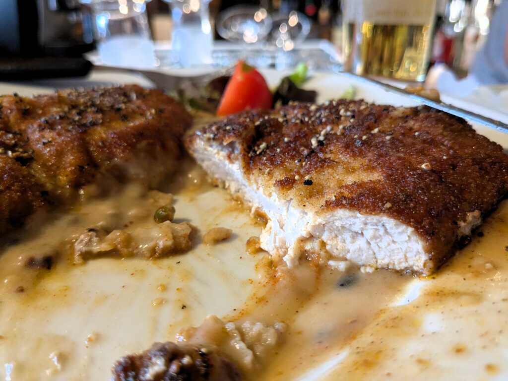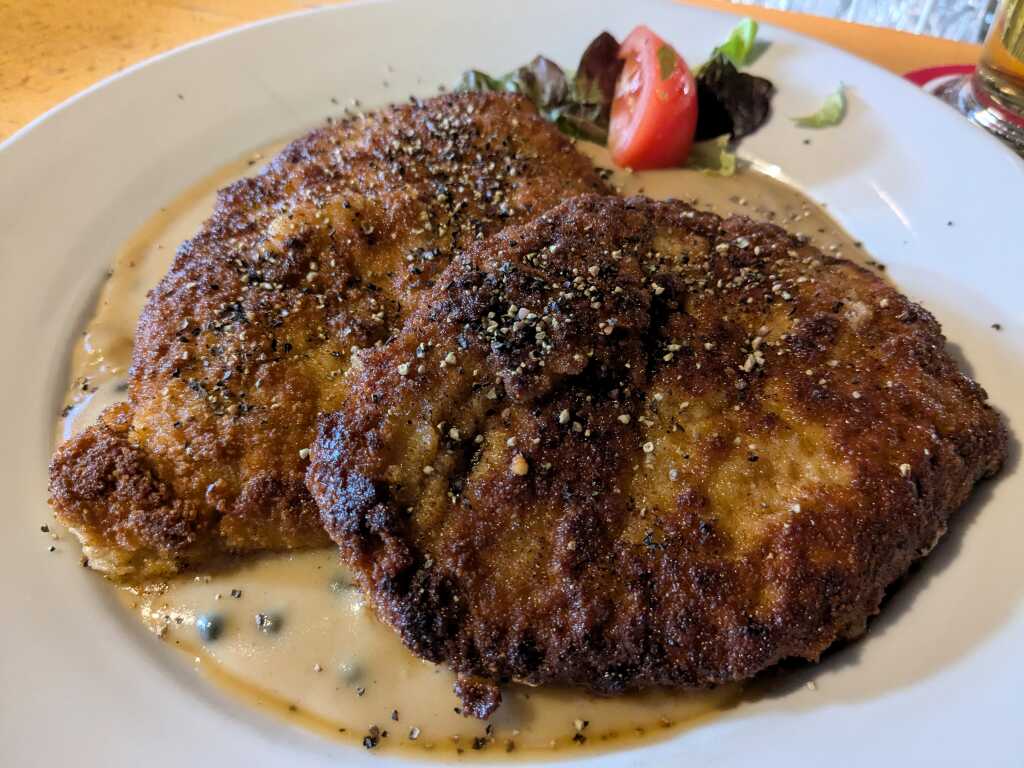 Zu meiner Linken wurde bald ordentlich was weggeschnitzelt. Auch mir gefiel das eindeutig nach Sättigung trachtende „Paniergehabe“ meiner temporären Thekengenossen. Von der umfangreichen Schnitzelkarte wählte ich das am meisten gepfefferte. Ein Kollege von der Wörther Gourmand-Genossenschaft hatte sich jenes Pfefferschnitzel (18,90 Euro) vor ein paar Jahren mal gegönnt.