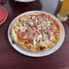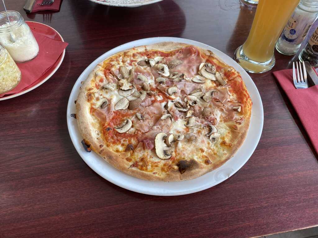 Die Pizza diesmal mit einem anderen Belag. Der Boden wieder klasse gebacken, außen knusprig nach innen weicher . Sie hatte wieder eine ordentliche Größe, Der Teig, das Sugo und der Käse passte wieder vom Geschmack her. Die Champignons reichlich vertreten in dünnen Scheiben vorhanden und frisch. Auch beim Schinken gab es nichts zu meckern.