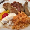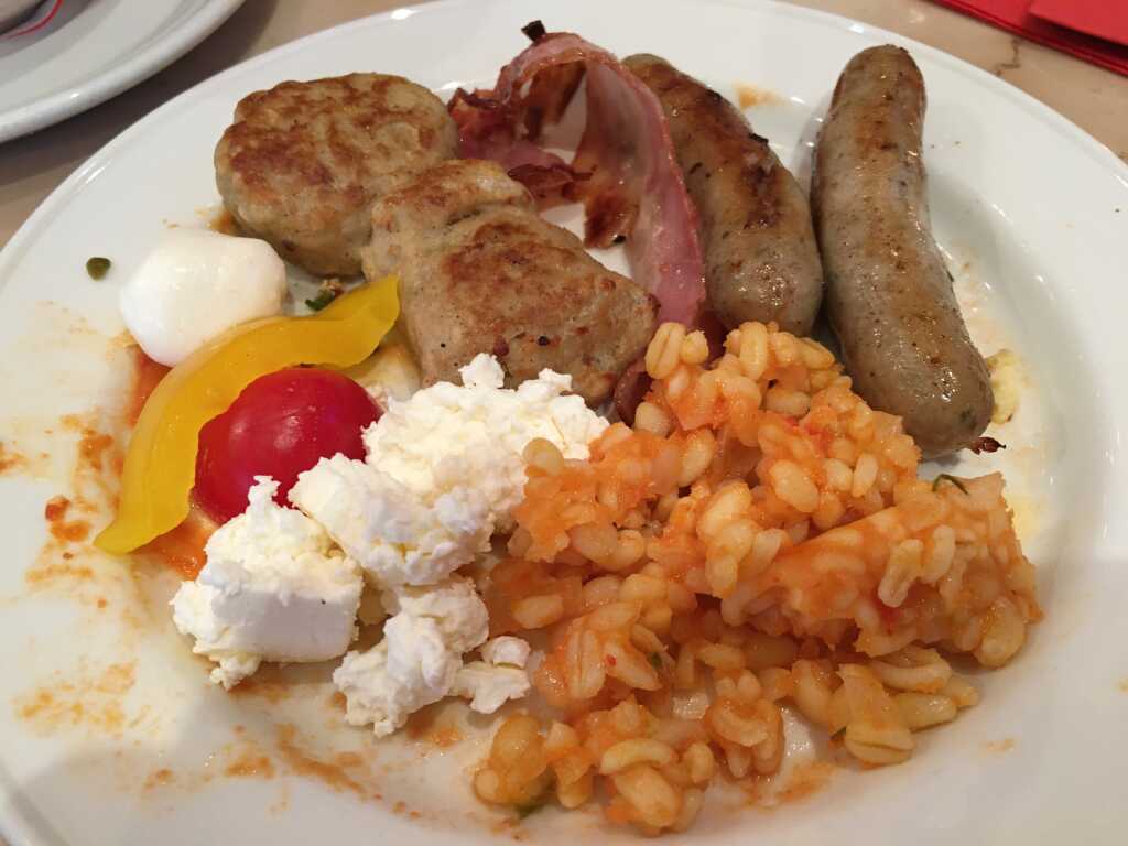 Der Speck war heute nicht besonders kross. Ebenfalls waren die kleinen Würstchen recht hell gebraten. Auch die Frikadellchen waren nur gut durch.