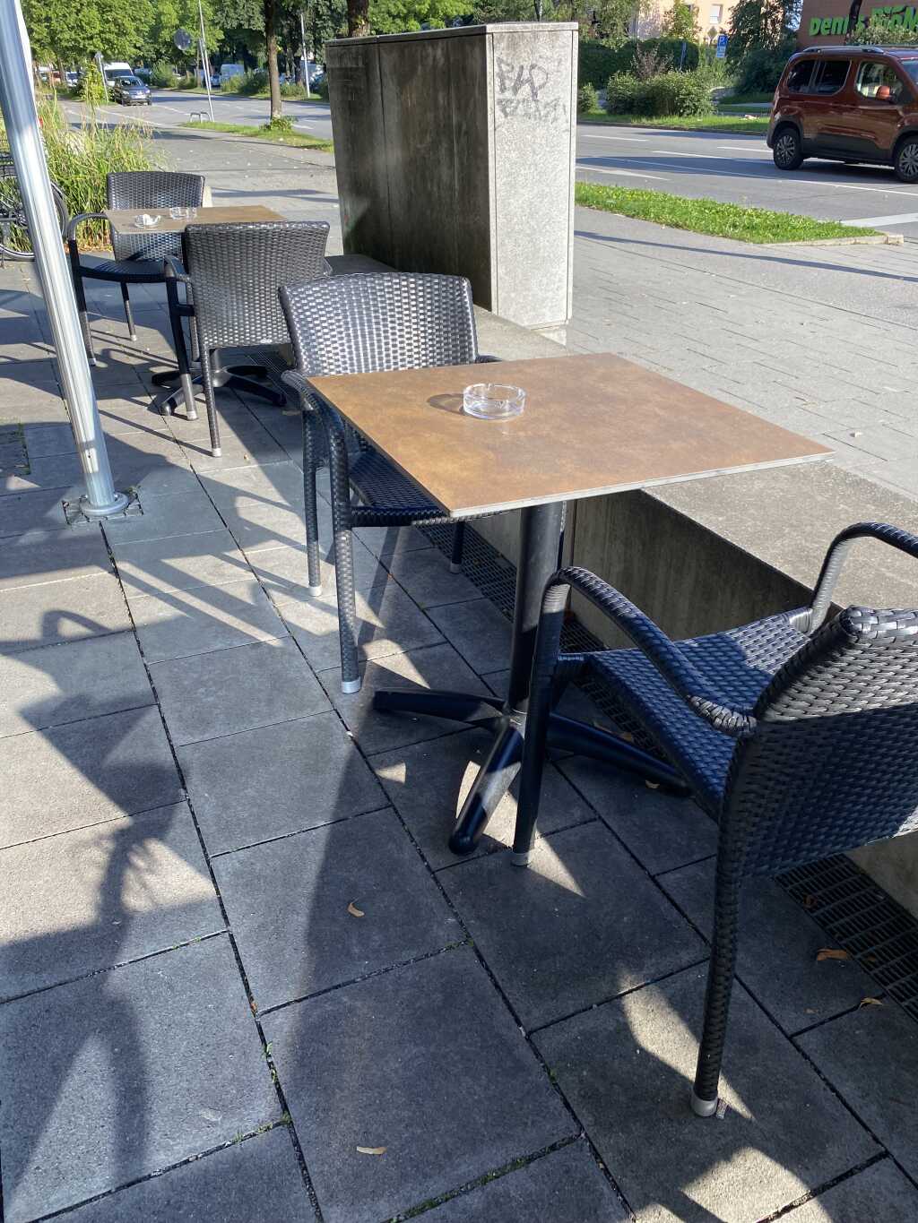 Schlicht , einfach, zum nicht lange verweilen, das könnte man einladender machen. Innen wäre es gar nicht so schlecht, aber der Außenbereich , ja , für schnell nen Kaffee und ne Zigarette. Ja, was machen wir nun ? Wir sagen einfach mal 2 Sterne