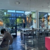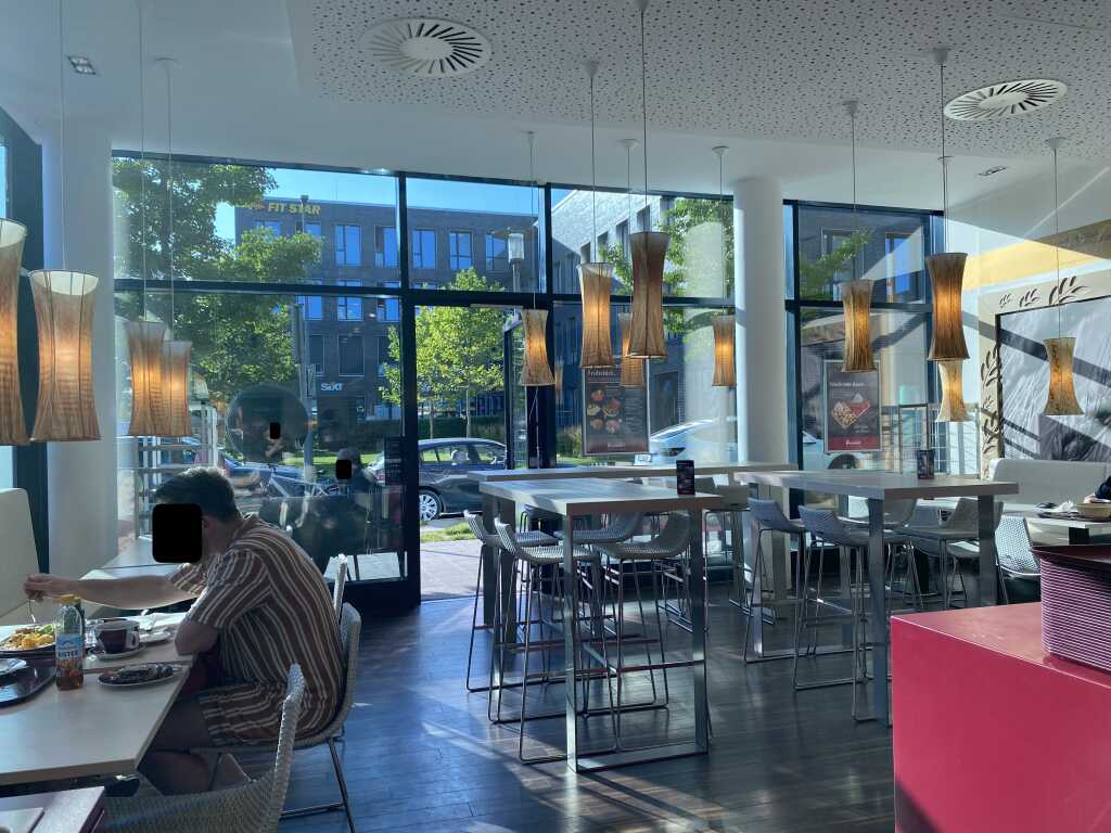 Hier gibt es verschiedene Bereiche zum Platz nehmen. Linker Hand vom Verkaufstresen gibt es normale Tische und Stühle. Rechter Hand Art Barhocker und hohe Tische mit dazu. Hier hat es gar nicht so schlecht ausgesehen für eine Bäckerei.